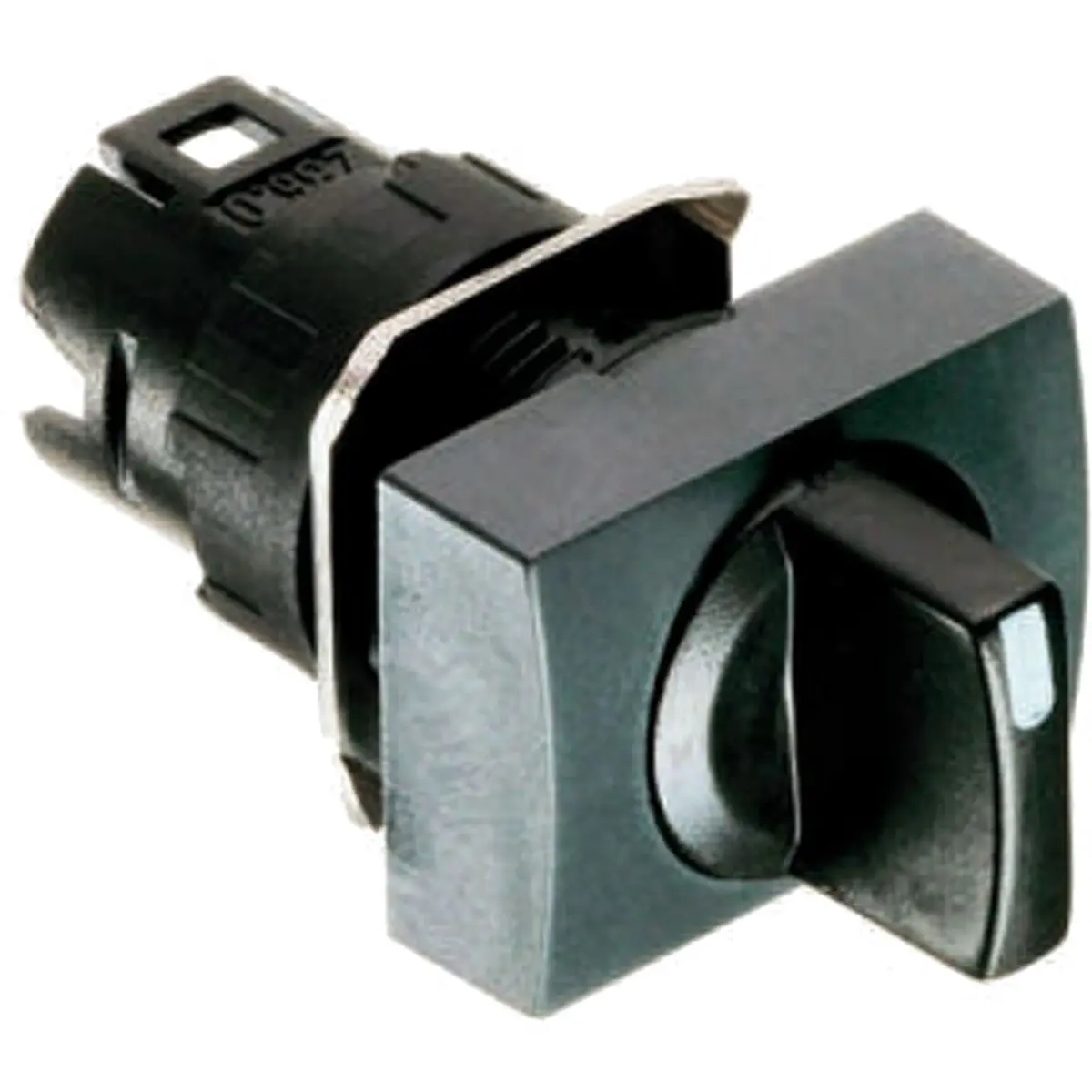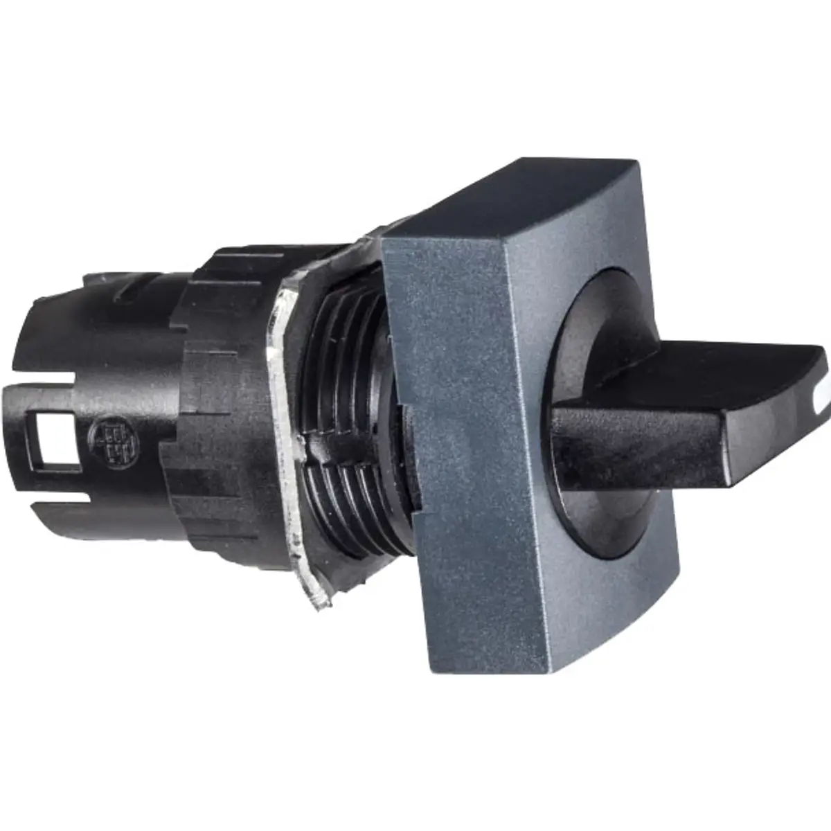 Esta cabeça de interrutor seletor, preta, com pega normal e estrutura quadrada, tem 2 posições estáveis: uma ao centro e outra 45° à direita.
