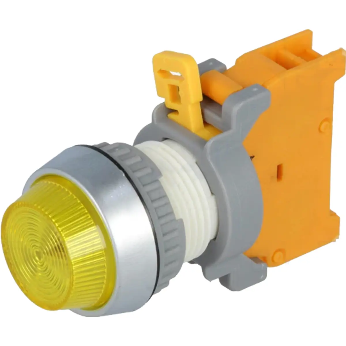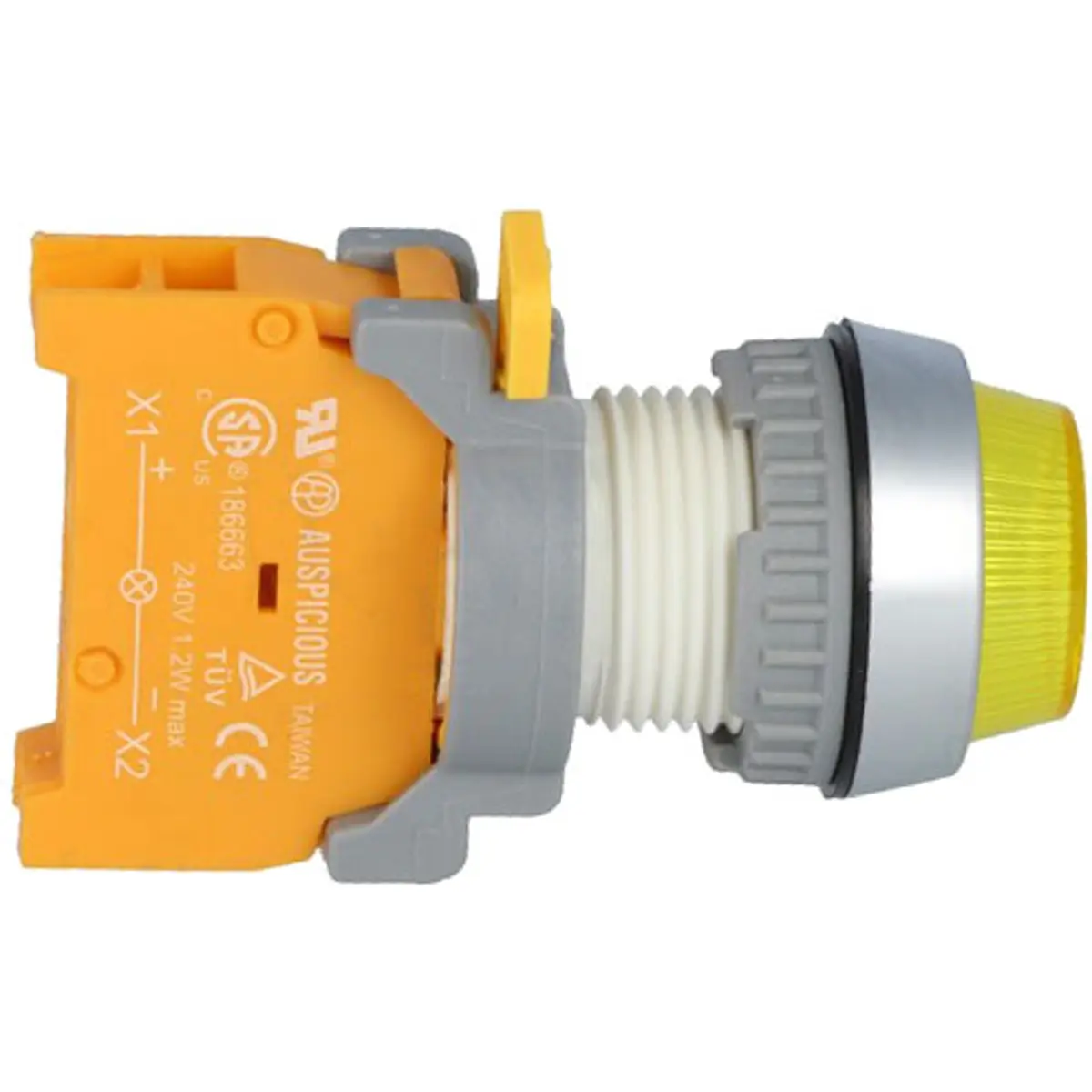Este sinalizador luminoso Ø22mm é uma luz de indicação para painéis, compatível com lâmpadas BA9S de até 1,2 W a 240 V. Possui difusor amarelo, montagem em furo Ø22,5 mm e classe de proteção IP65, adequado para uso em condições de -20°C a 60°C. Não acompanha a lâmpada; utiliza a série PLN22 e pode ser usado com várias lâmpadas BA9S disponíveis no mercado. Ideal para painéis de instrumentos, avisos visuais e sinalização de estado em ambientes internos protegidos.