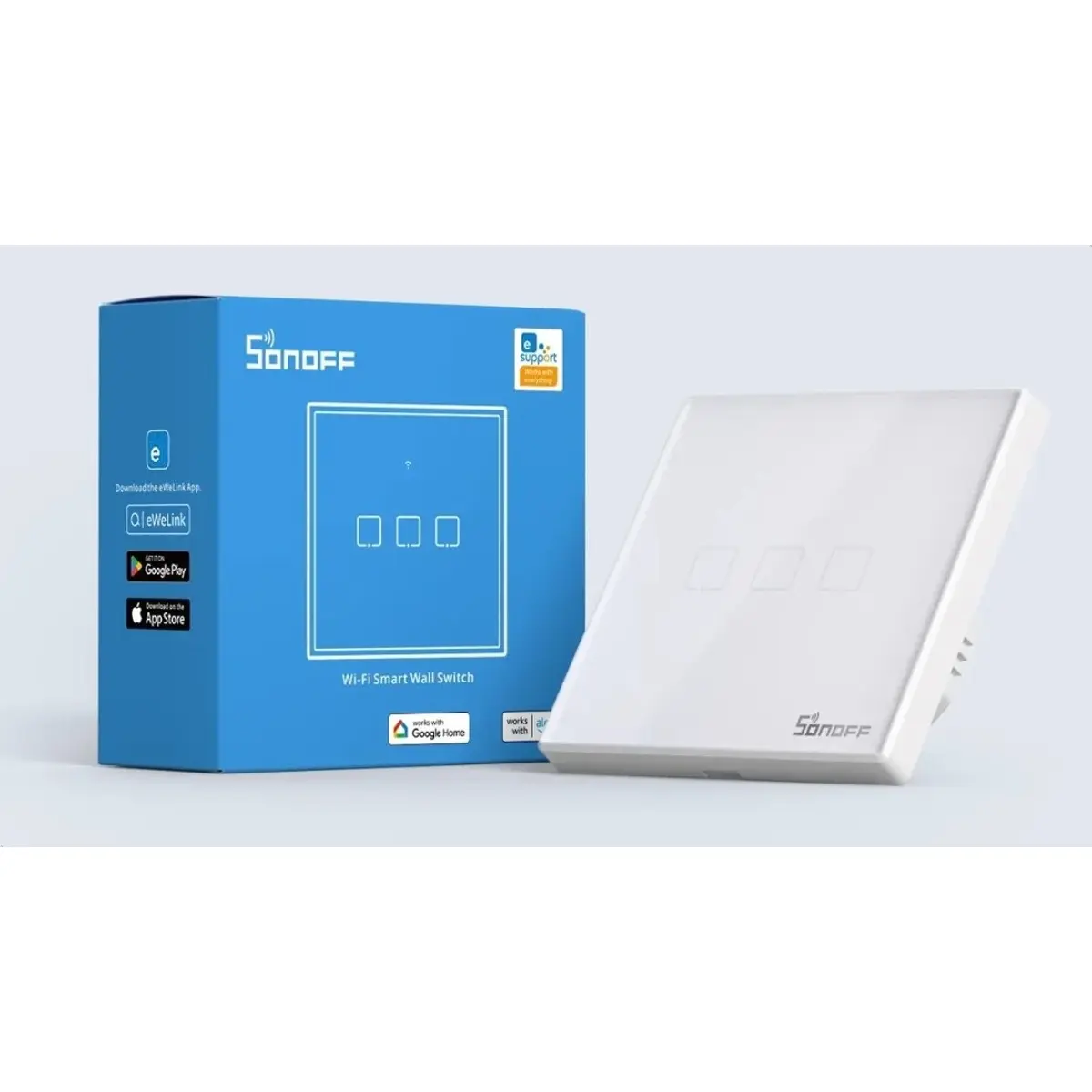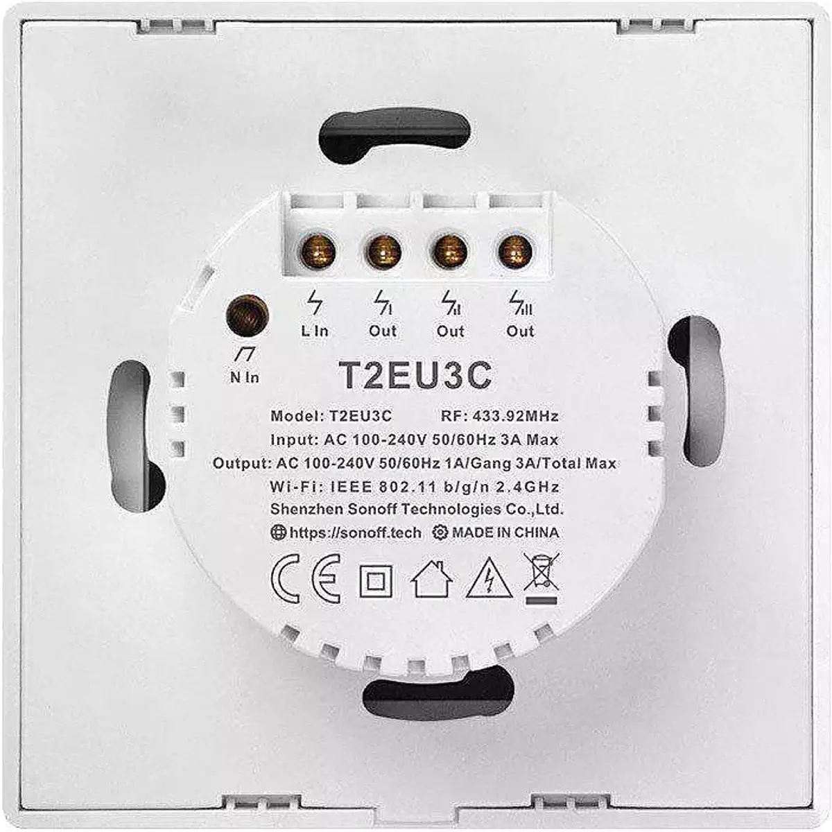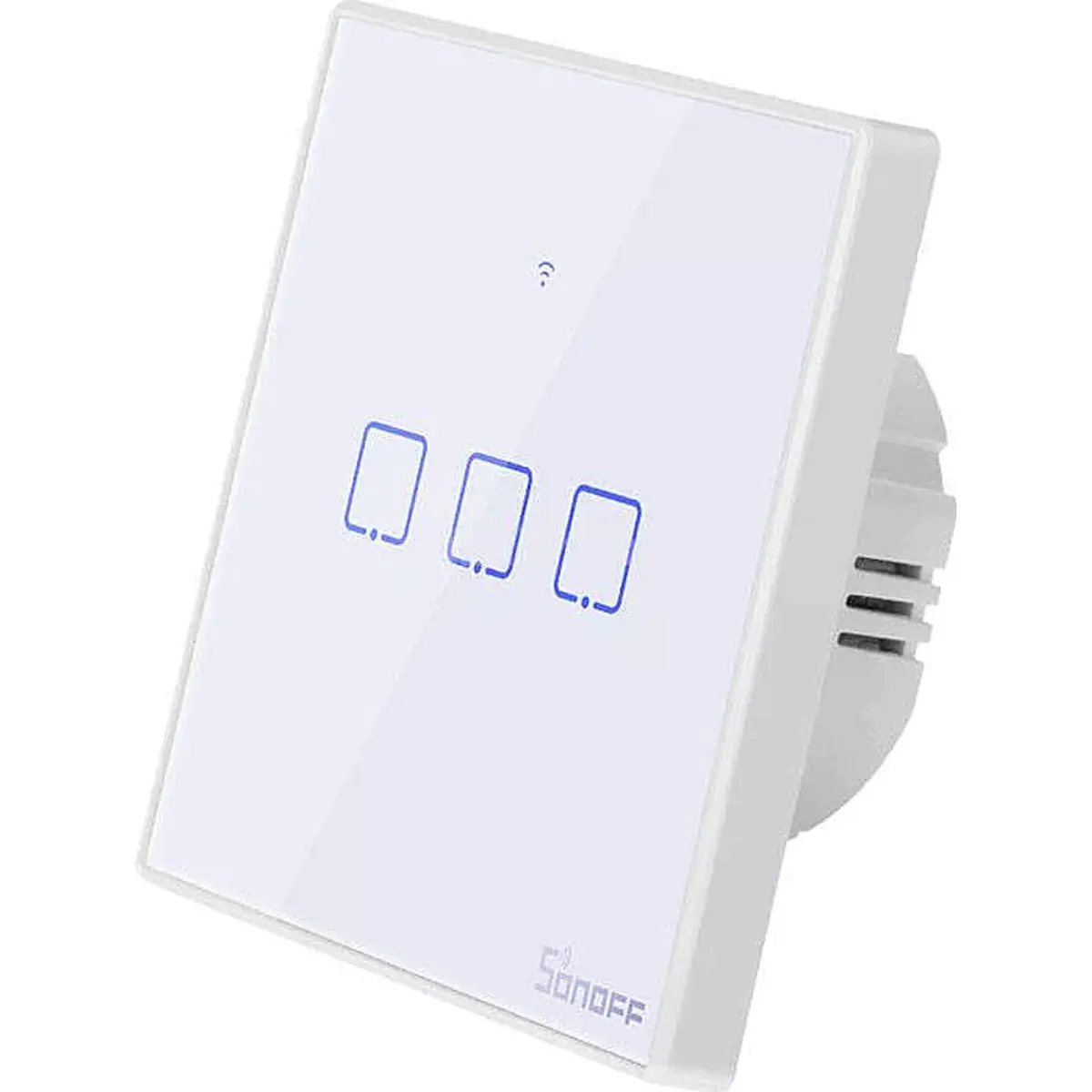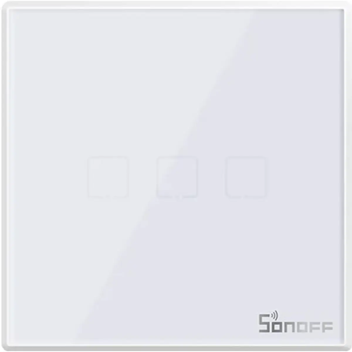 Este interruptor de Parede Sonoff T2 possui 3 botões sensíveis ao toque (para um controlo local) e um design elegante, que acrescenta uma decoração moderna e sofisticada à superfície da sua parede.