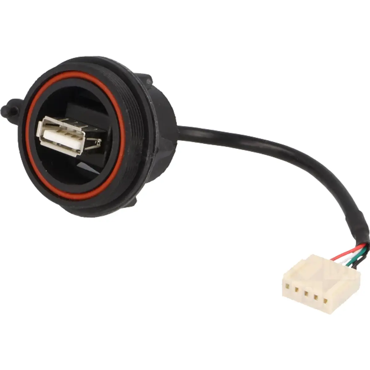 Conector USB-A fêmea circular de painel com rosca, IP68, resistente a água e poeira, concebido para montagem em superfícies, versão 2.0 e cabo de 13 cm de comprimento. Compatível com fichas PX0840/A, PX0841/AB e PX0733, oferece fixação segura, desempenho estável e proteção contra intempéries. Ideal para aplicações industriais, automação e equipamentos expostos a condições ambientais desafiantes, assegurando conectividade confiável com montagem discreta e proteção IP68.