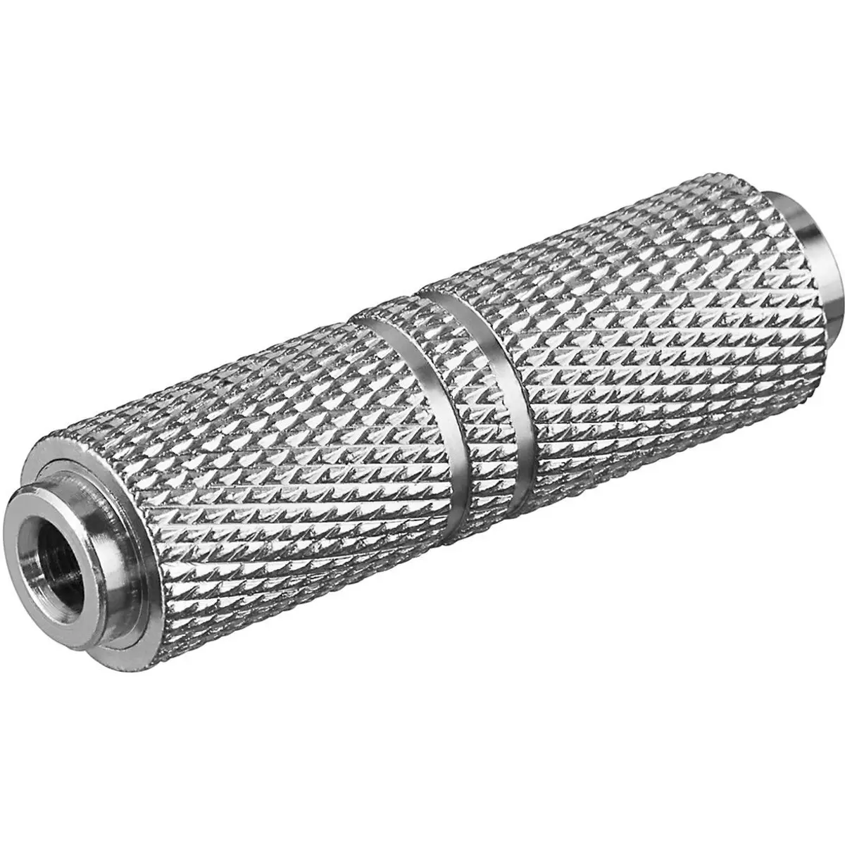 Adaptador de jack de 3,5 mm fêmea para fêmea com 3 pinos estéreo. Corpo em metal, compacto, permite ligar dois cabos macho de 3,5 mm em dispositivos com tomadas de áudio padrão, mantendo sinal estéreo.