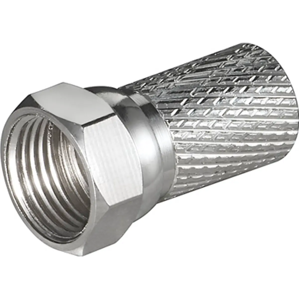 Conector F macho para cabo coaxial com fixação twist-on, em cobre niquelado, oferece encaixe estável e durável. Compatível com cabos com revestimento de aproximadamente 7 mm e dielétrico até 4,8 mm, inclui porca larga para aperto seguro. Ideal para ligações de transmissão de sinal em aplicações de televisão, rádio e redes, assegurando boa condução, resistência à corrosão e montagem simples sem ferramentas especiais.