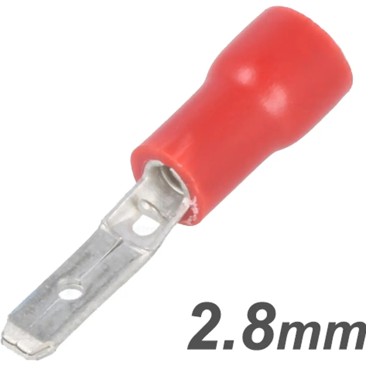 Terminal macho isolado, de cor vermelha, compatível com condutores de 0,5 a 1,0 mm², com dimensões de 2,8 x 0,8 mm. Destinado a ligações elétricas em conectores do tipo Faston, oferecendo montagem simples e segura em aplicações elétricas.
