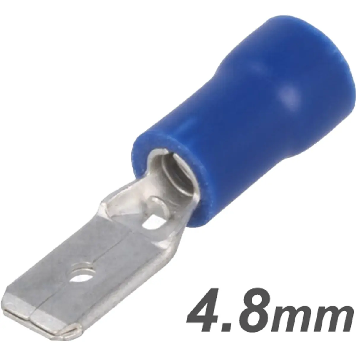 Terminal macho isolado azul, adequado para fios com secção de 1,5 a 2,5 mm². Possui dimensões de 4,8 x 0,8 mm, permitindo ligações simples em circuitos elétricos com condutores de pequena a média secção. A cor azul facilita a identificação visual das ligações, enquanto o isolamento contribui para a segurança e fiabilidade das ligações em quadros elétricos e caixas de ligações.