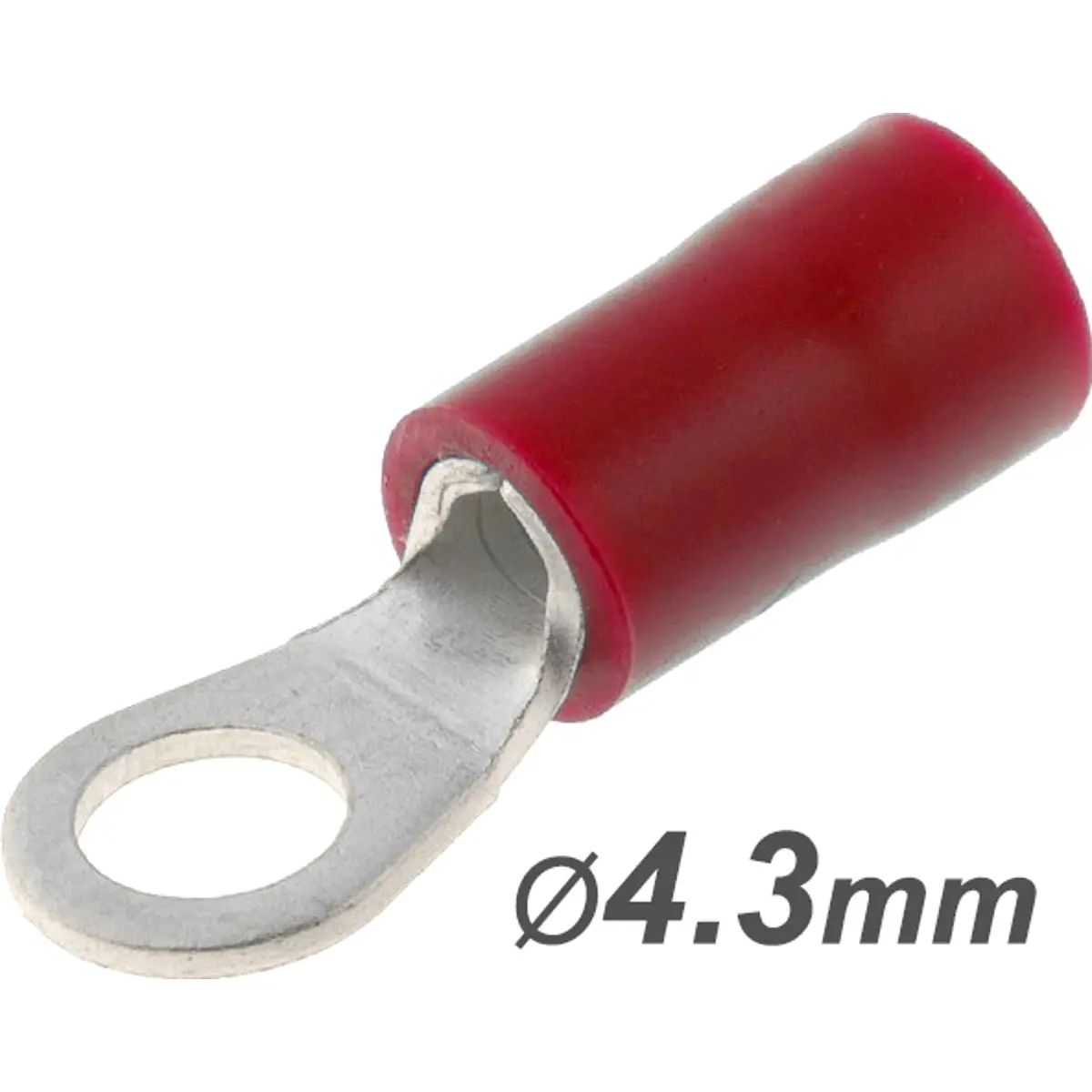 Terminal de olhal isolado vermelho para cablagem eléctrica, com terminal tipo anel e abertura para parafuso M4. Montagem eléctrica por cerrar e montagem mecânica com cabo. Ponta isolada, contacto de cobre com acabamento estanhado. Diâmetro interno do olhal de 4,3 mm, compatível com cabos de 0,5 a 1,5 mm2. Ideal para ligações seguras, com boa condução de corrente, resistência à corrosão e fiabilidade em cablagens de dimensões pequenas.