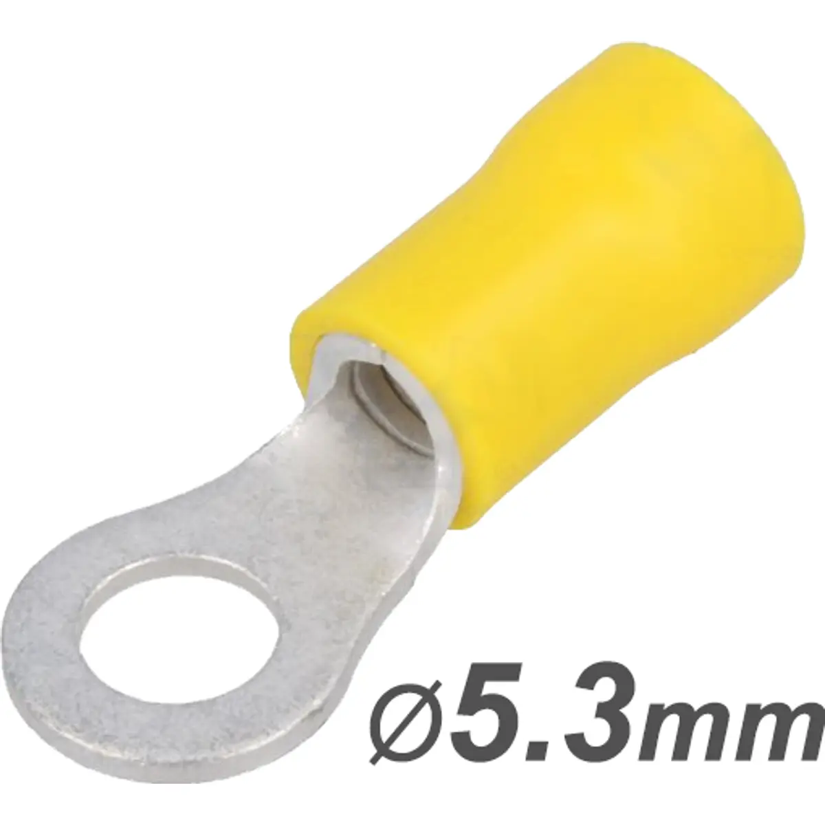Terminal de olhal isolado amarelo para condutores de 4,0-6,0 mm², com furo Ø5,3 mm e rosca M5. Proporciona isolamento elétrico e facilita a identificação de cabos pela cor amarela, tornando-o adequado para ligações elétricas que exigem isolamento e fixação segura.