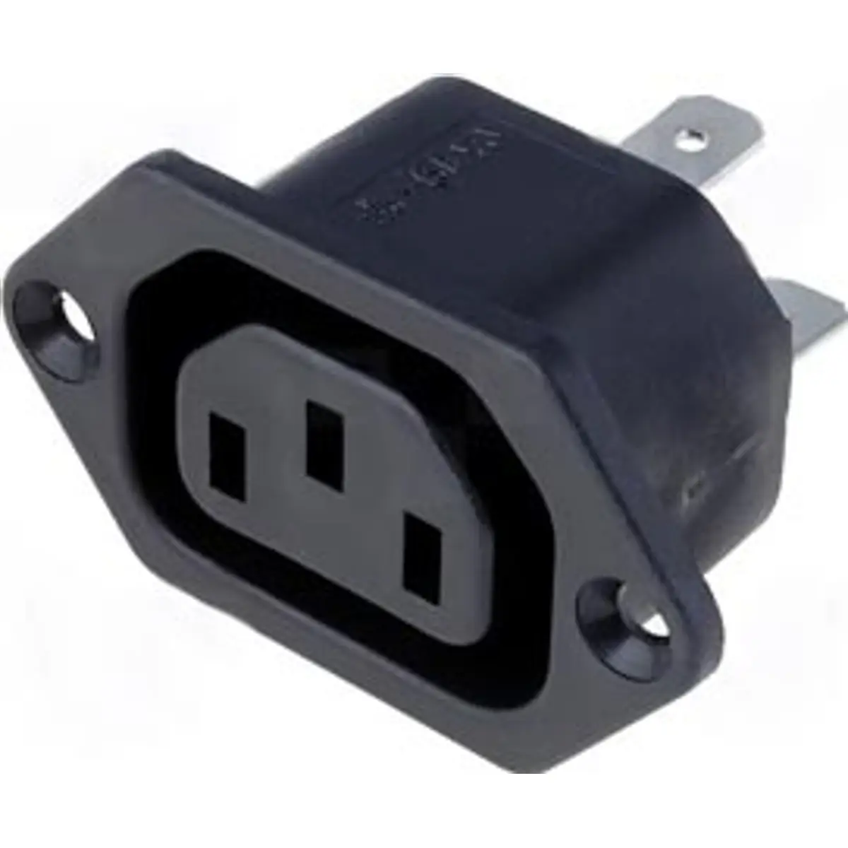 Conector IEC C13 fêmea de montagem em painel, conforme IEC 60320, em poliamida, destinado a alimentação com capacidade de 10A a 250VAC. Montagem mecânica roscada para painel, com furo de fixação de 3.4mm. Dimensões de montagem: 32.26x24.77mm e 40mm de profundidade, compatível com montagem em painéis. A peça apresenta grau de inflamabilidade UL94V-0 e suporta temperatura de funcionamento entre -40°C e 70°C. O conector é adequado para aplicação em fontes de alimentação, equipamentos industriais e outros dispositivos que exijam uma ficha IEC C13 fêmea.