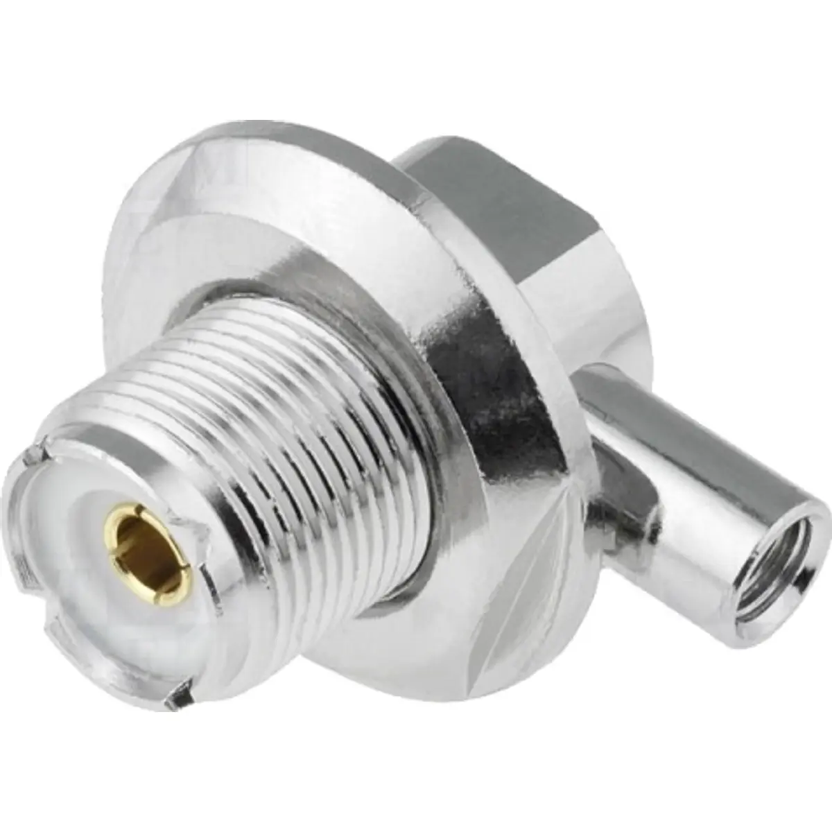 Conector UHF fêmea de painel com orientação de 90° para cabos RG59. Montagem eléctrica: torção e soldagem do pino central. Montagem mecânica: montagem em painel. Adequado para ligações RF, permite ligação segura entre painel e cabo, com montagem estável e compatível com equipamentos de telecomunicações.