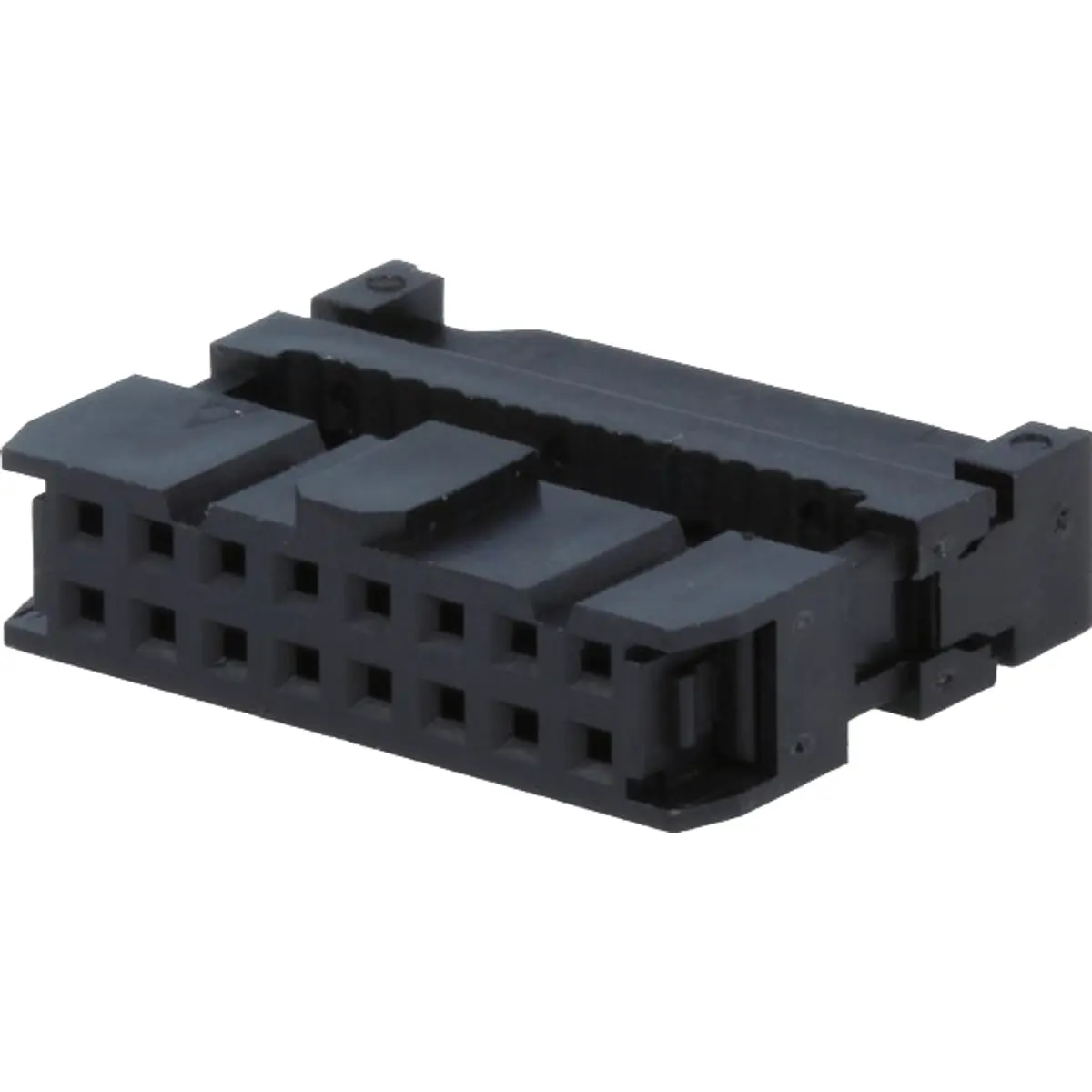 Conector IDC fêmea para cabo plano com 16 pinos dispostos em 2x8. Passo entre pinos: 2,54 mm; distância entre contactos do cabo plano: 1,27 mm. Ideal para ligações rápidas entre cabos planos e placas em montagens electrónicas, proporcionando encaixe estável, montagem simples e boa compatibilidade com padrões de 2,54 mm, garantindo fiabilidade de contacto.
