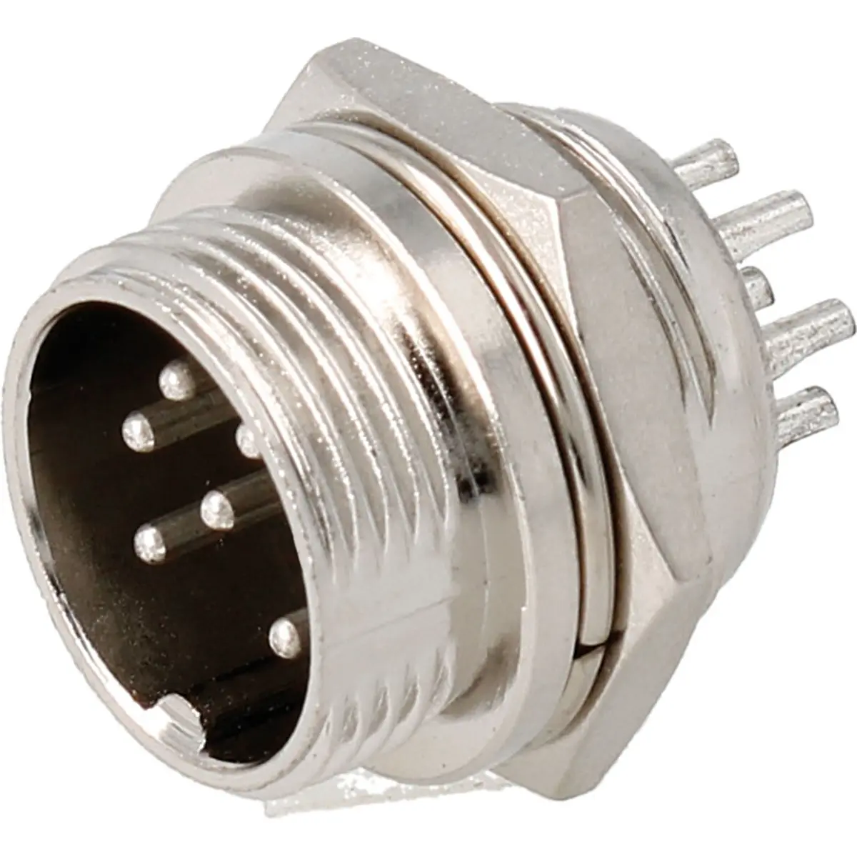Conector de microfone macho de 6 pinos para montagem em painel, com diâmetro da abertura de 16 mm. Ideal para ligações de áudio em painéis, assegura ligação estável e fiável, com montagem simples e compatibilidade com conectores circulares padrão para painéis industriais.