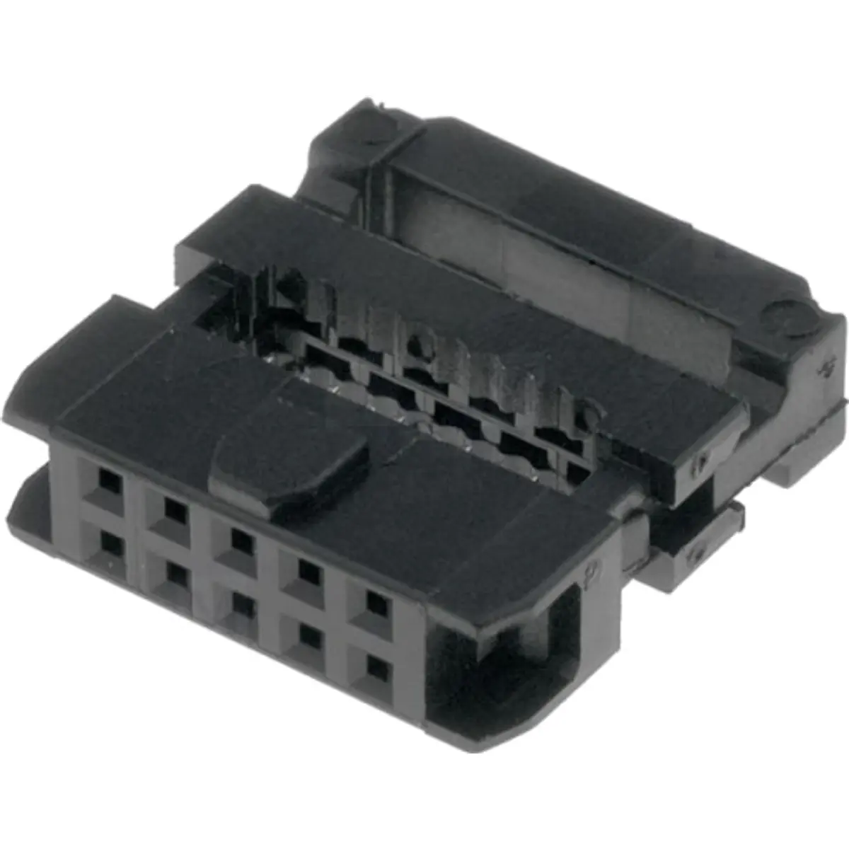Conector IDC fêmea de 10 pinos para fita plana, com arranjo 2x5 e contactos dourados. Oferece montagem elétrica IDC e montagem mecânica para fita, com passo da fita de 1,27 mm e passo entre contactos de 2,54 mm. Ideal para ligações rápidas e estáveis em projetos de eletrónica, compatível com cabos de fita plana e cablagem IDC, proporcionando conectividade fiável em aplicações de prototipagem, automação e montagem de hardware.