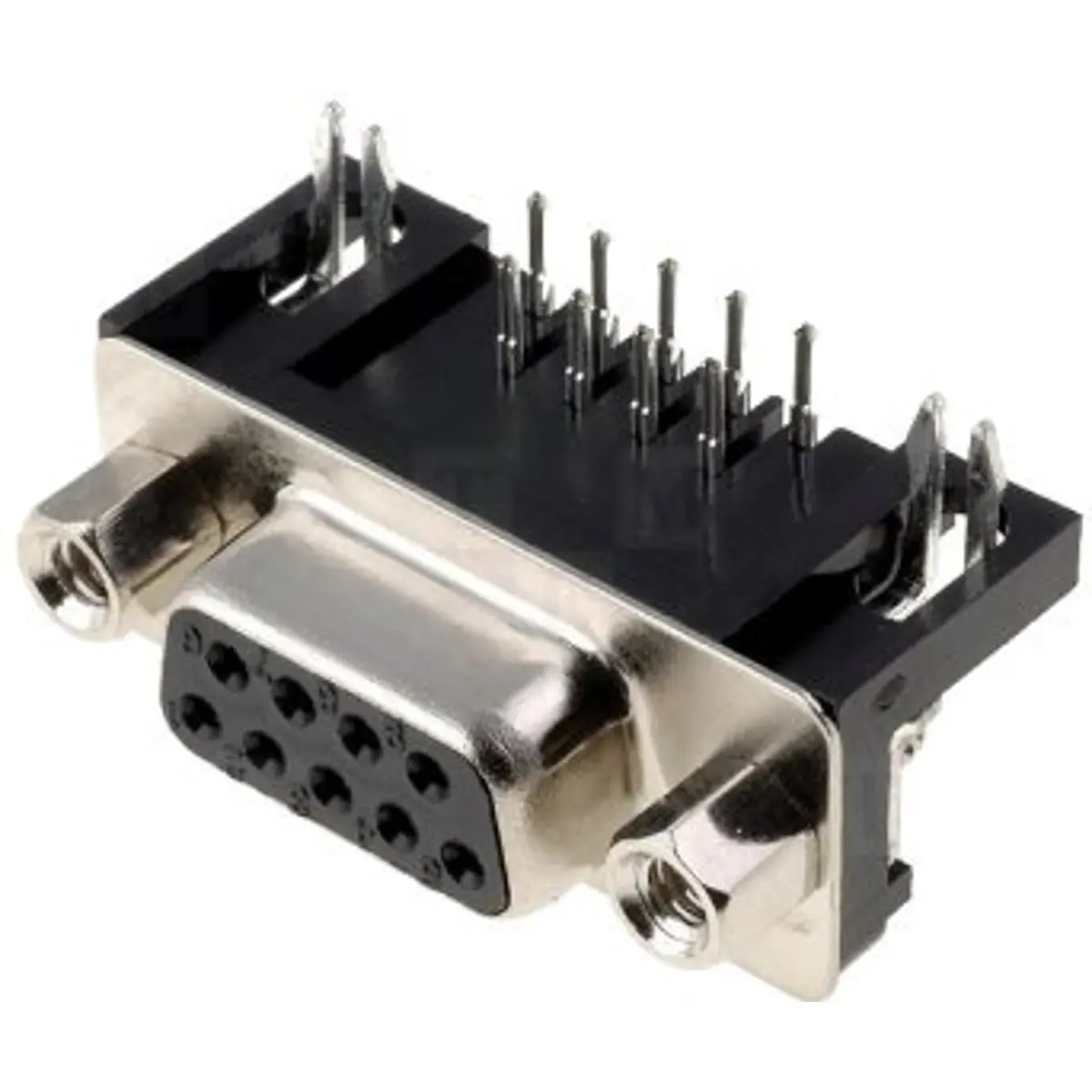 Conector D-Sub DB9 fêmea para montagem em PCB (THT) com ângulo de 90°. Possui 9 pinos, resistência de contacto até 15 mΩ e faixa de temperatura de operação entre -55°C e 105°C. Ideal para ligações de sinal em equipamentos industriais e informáticos, oferecendo fiabilidade, montagem por solda e compatibilidade com conectores padrão.