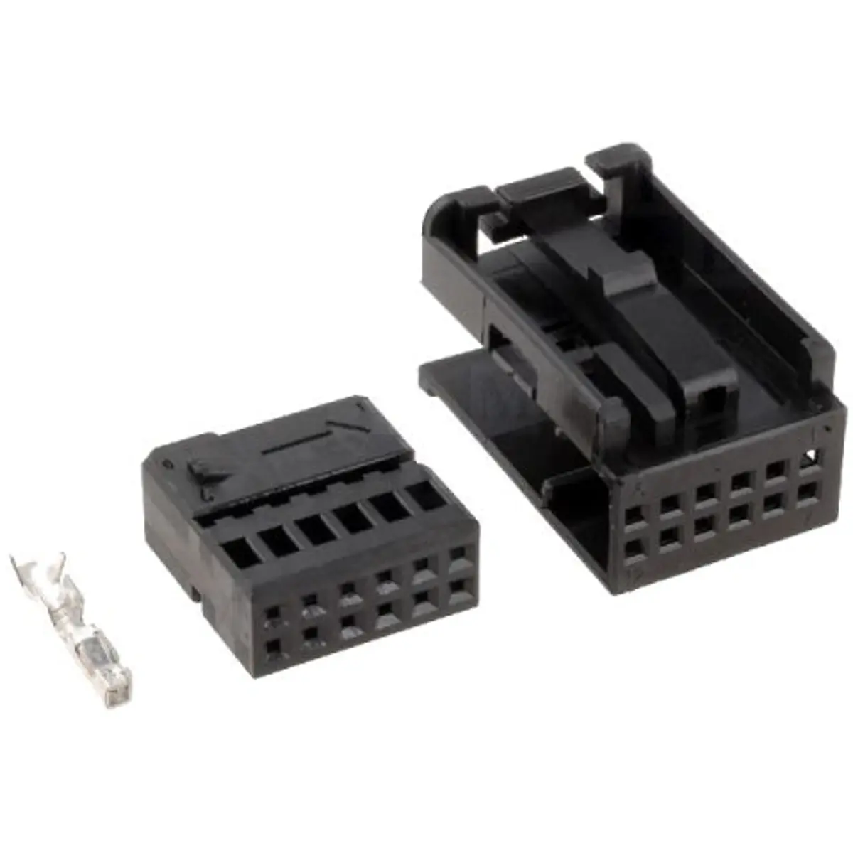Conector fêmea Quadlock com 12 pinos, cor preta e peso de 10g. Descrição técnica resumida: tipo de conector Quadlock, número de pinos, cor e peso são os aspetos essenciais para a seleção de componentes.