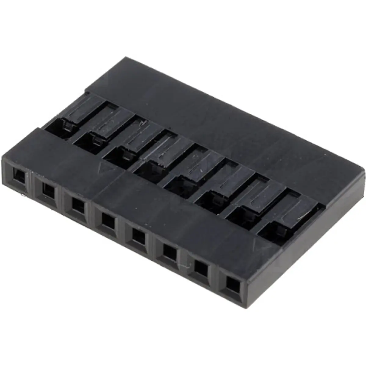 Conector elétrico com 8 pinos (1x8) sem terminais, projetado para ligações em placas de circuito impresso. Possui distância entre pinos de 2,54 mm, dimensões compactas de 20,52 x 17,78 mm e tensão máxima de 250 V, permitindo utilização em circuitos de baixa e média potência. Requer a instalação de terminais para funcionamento adequado. Ideal para aplicações que exigem várias vias em espaço limitado, com montagem simples e compatibilidade com terminais padrão de 2,54 mm.