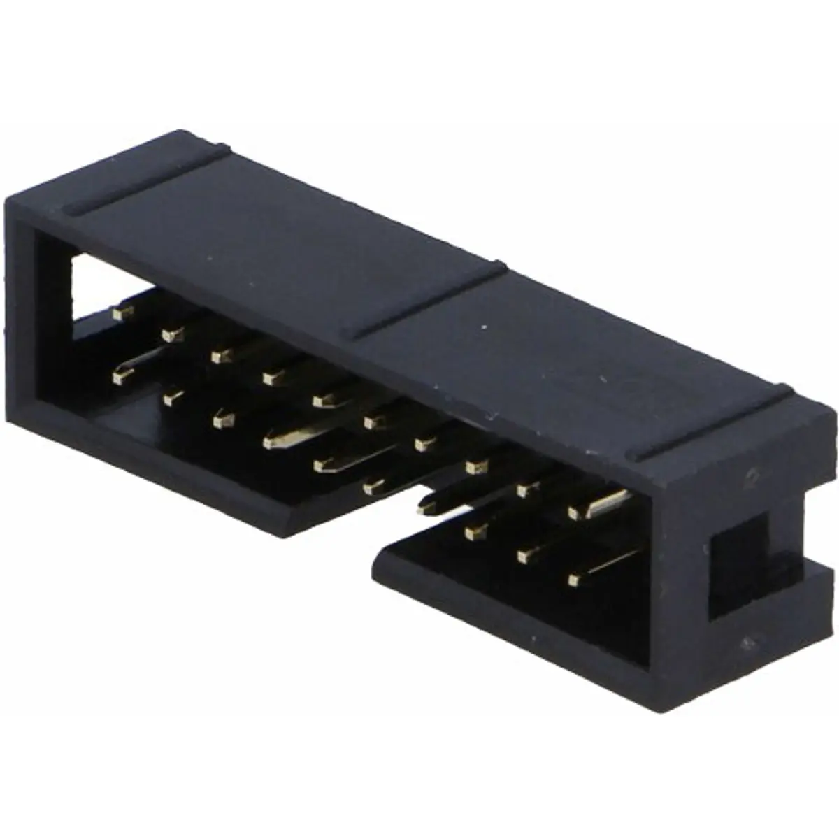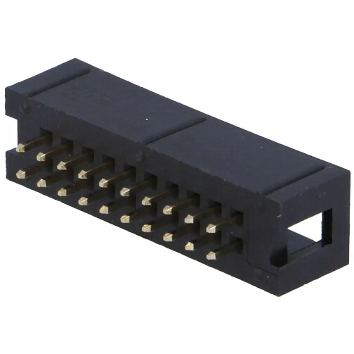 Conector IDC de 20 pinos, macho, formato 2x10, para soldar em PCB, com distância entre pinos de 2,54 mm. Utilizado para ligações entre cabos IDC e placas de circuito impresso, apropriado para montagem em PCB.