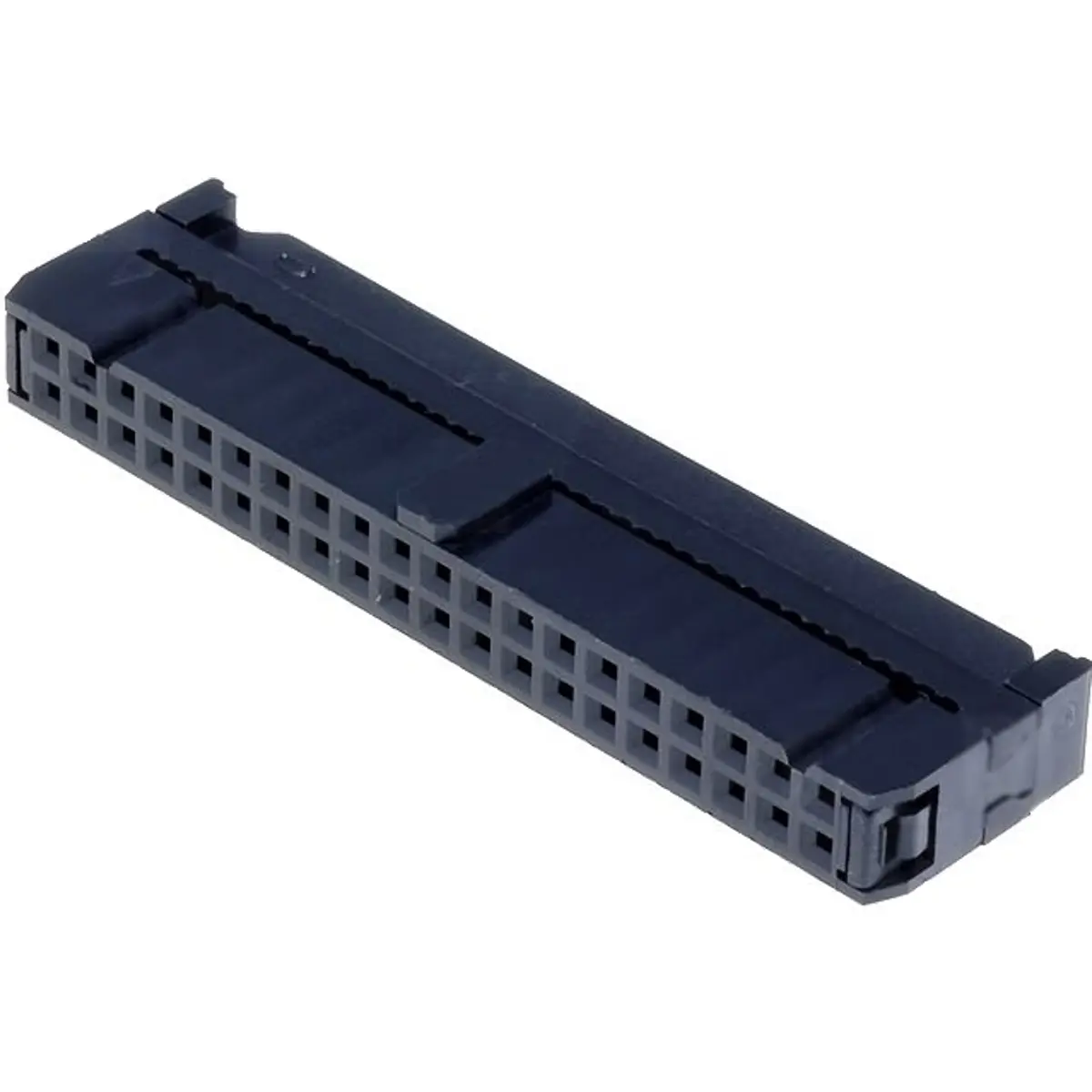 Conector IDC fêmea de 40 pinos (2x20) para ribbon-cable de 1,27 mm, com passo entre pinos de 2,54 mm. Compatível com ribbons de 1,27 mm para ligações entre componentes em placas e montagens que utilizem este tipo de conector IDC.