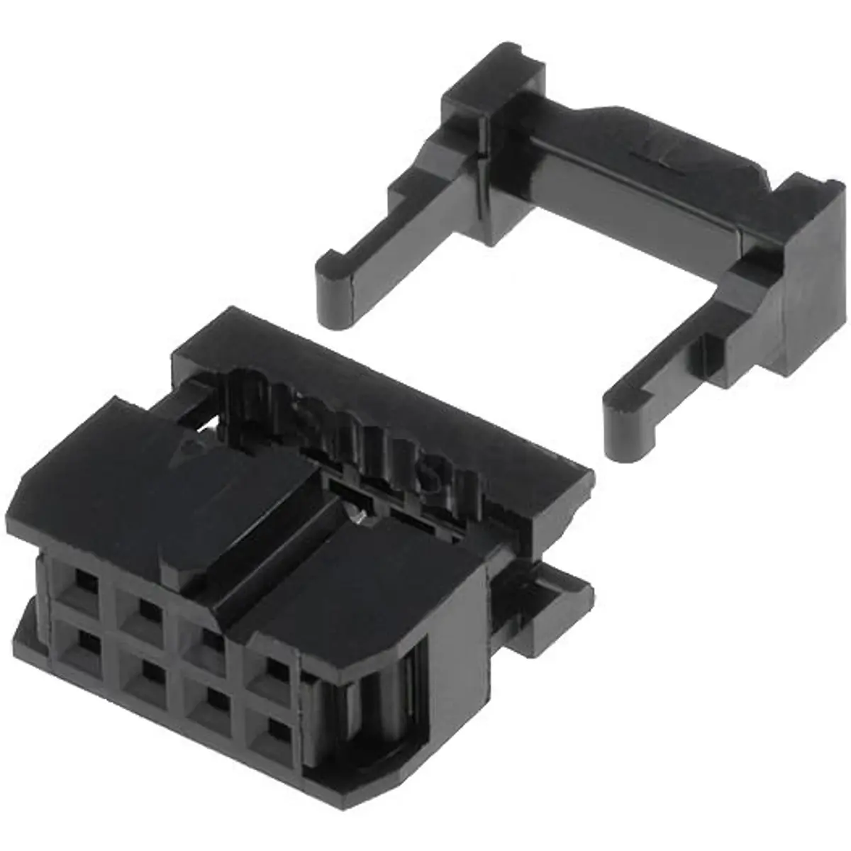 Conector IDC fêmea de 8 pinos, arranjo 2x4, com passo entre pinos de 2,54 mm e distância entre contactos do flat-cable de 1,27 mm. Destina-se a ribbon-cable de 1,27 mm, oferecendo uma interface simples e fiável para ligações entre componentes. Mantém uma distância entre pinos estável, facilitando a montagem de ligações rápidas com cabos de fita de 1,27 mm em projetos eletrónicos.