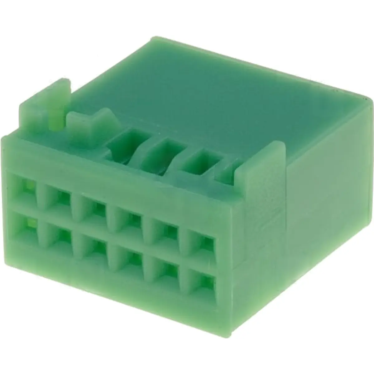 Ficha fêmea com 12 pinos para conector Quadlock, na cor verde, compatível com VW 2011-> e que requer terminais com a referência 011-0986. Pesa 1.45g. Esta solução de substituição é adequada para conectores automotivos que utilizam o padrão Quadlock, assegurando encaixe compatível com os componentes do mesmo tipo e facilitando a instalação de circuitos elétricos em veículos.