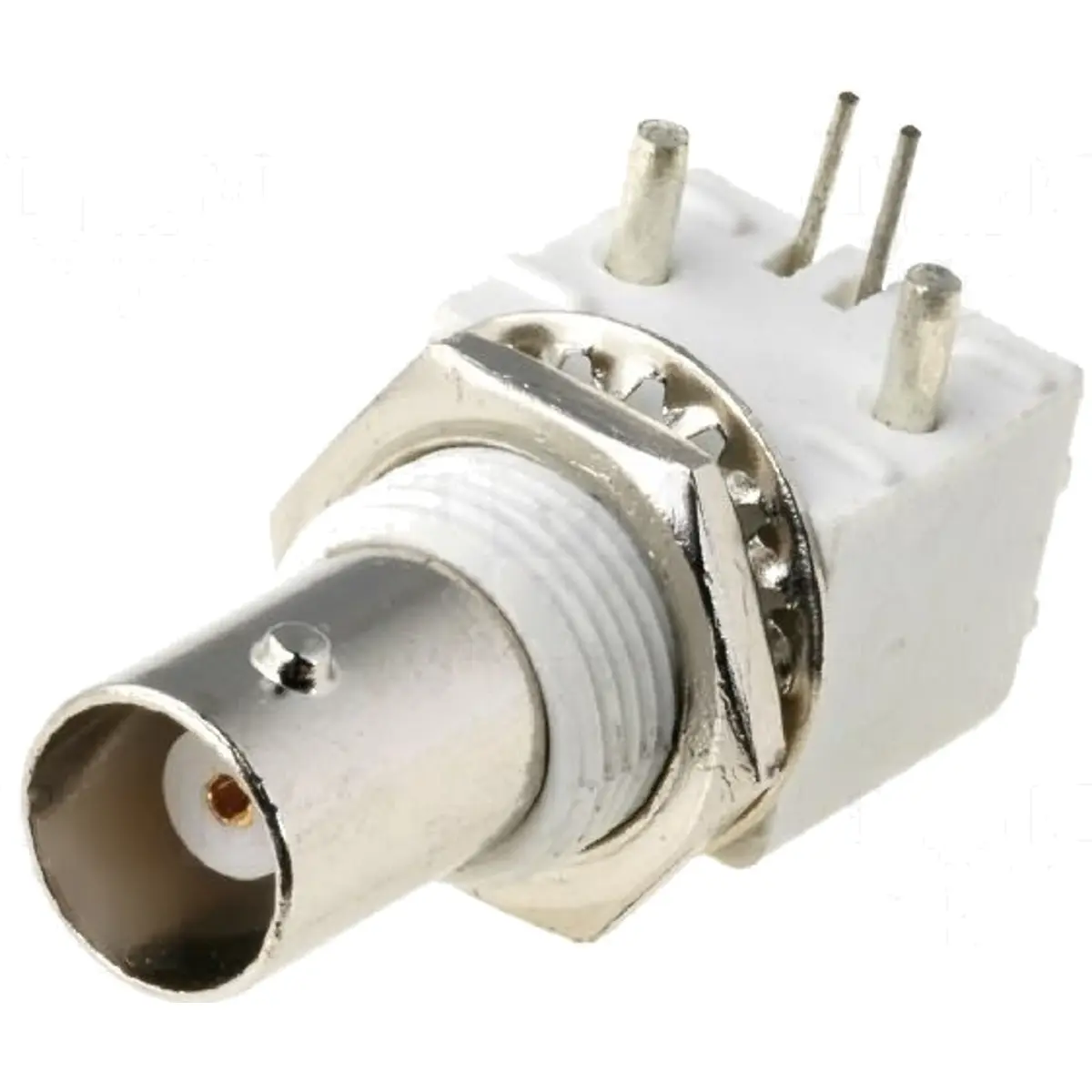 Ficha BNC para soldar em PCB a 90º, com impedância de 50 ohm, tensão máxima de 500 V e frequência máxima de 4 GHz, adequada para ligações RF em PCB. Ideal para prototipagem, testes e integração de sistemas que requerem conectividade BNC de montagem em ângulo.