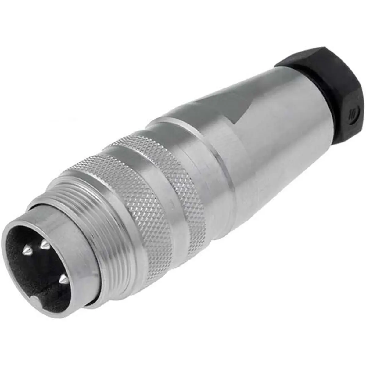 Conector circular macho metálico, DIN M16, série C091D, com 3 pinos. Classe de estanqueidade IP67, adequado para uso em ambientes industriais, com tensão de operação até 300 V e corrente de 5 A. Amplitude de temperatura de funcionamento entre -40°C e 100°C. Design robusto e fiável para ligações de alimentação, compatível com o padrão DIN para conectores circulares, ideal para montagem em invólucros e painéis expostos a condições adversas, com boa resistência a poeira e água.