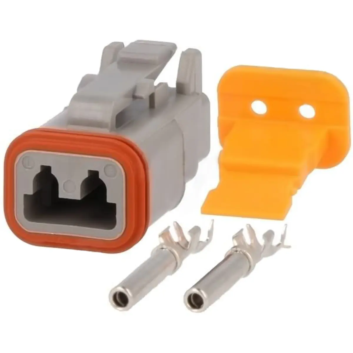 Conector fêmea fio-a-fio da série DT para cabos entre 0,75 e 2 mm², com 2 pinos. Montagem mecânica para cabo e montagem eléctrica por cravar. Suporta até 13 A e é estanque até 3 pés de profundidade, oferecendo fiabilidade em ligações automotivas.
