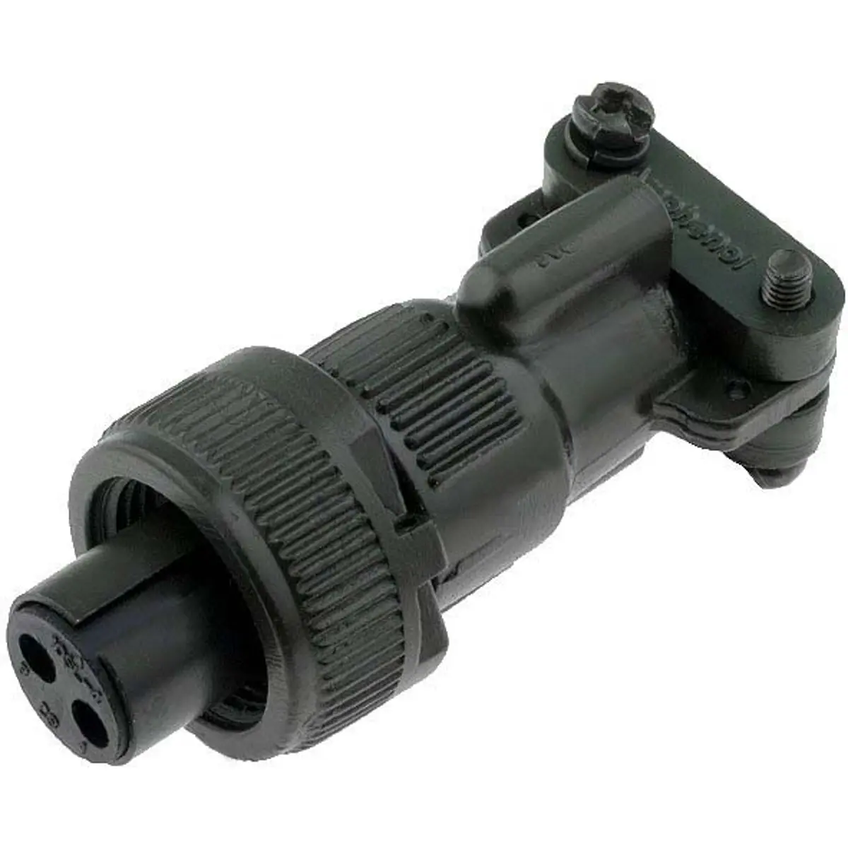 Conector circular DS/MS de 2 pinos fêmea, com aperto de cabo e montagem por solda, adequado para ligações industriais. Suporta 13A e até 700V DC, conforme MIL-C-5015. Carcaça em alumínio tamanho 10SL, acabamento cinza azeitona, com orientação simples e sistema de bloqueio torcido. Compatível com cabos de 0,5 a 1,5 mm2, ideal para aplicações que exigem resistência, fiabilidade e montagem robusta.
