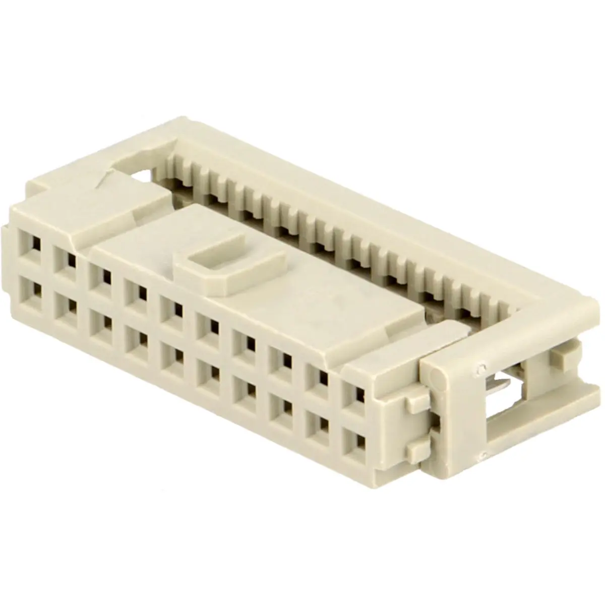 Conector IDC de 20 pinos, em configuração 2x10, fêmea, para cablagem plana. Possui passo entre pinos de 2.54 mm e distância entre contactos do flat-cable de 1.27 mm. Adequado para ligações em cablagem plana em aplicações de eletrónica, garantindo ligações estáveis entre cabos planos.