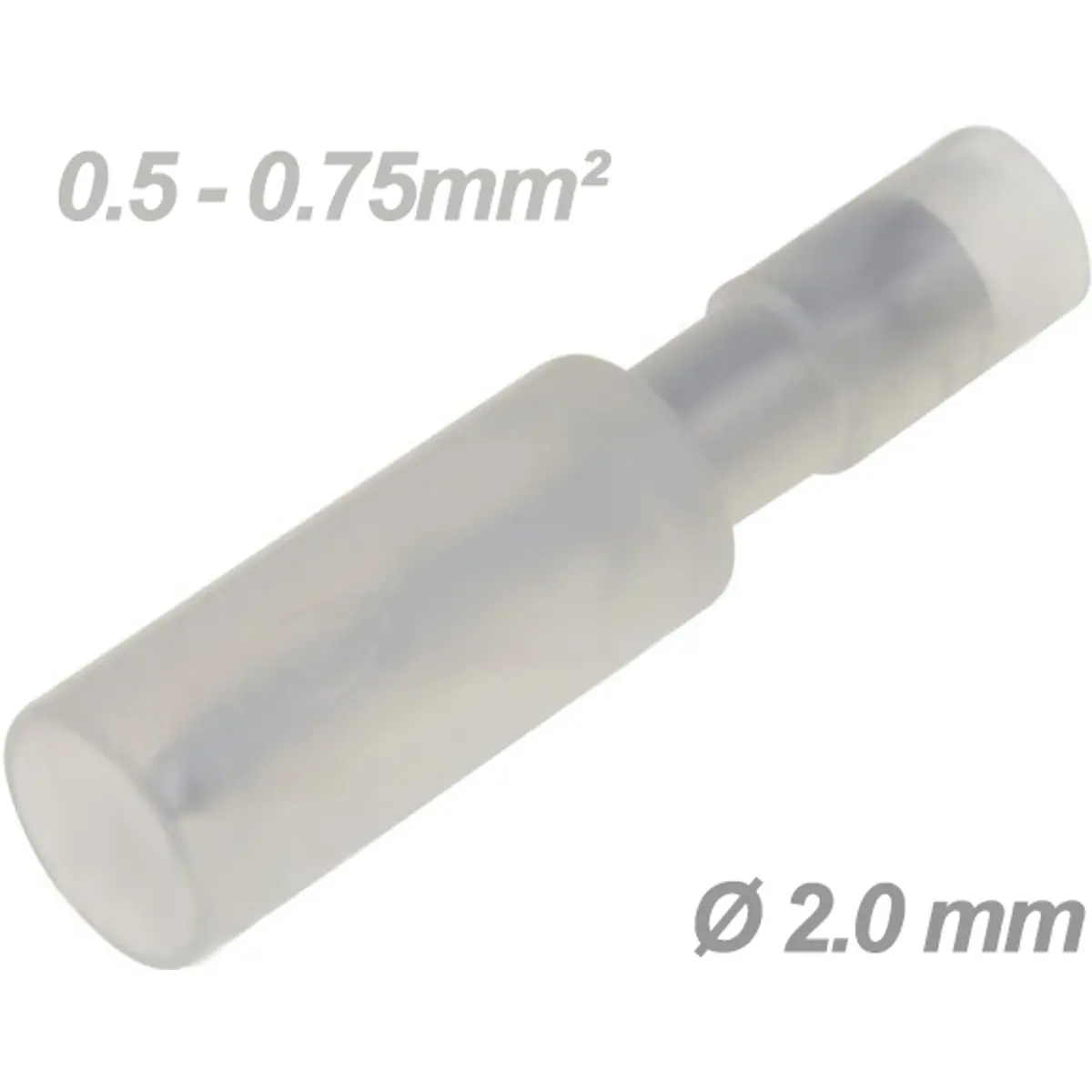 Conector redondo fêmea isolado para cravar, diâmetro Ø2.0mm e secção de cabo 0.5...0.75mm2. Corrente máxima 12A, classe de inflamabilidade UL94V-2. Montagem elétrica: cerrar; montagem mecânica: com cabo; ponta isolada. Adequado para ligações elétricas seguras com isolamento, compatível com terminais redondos fêmea isolados, mantendo o isolamento do condutor e a compatibilidade com cravar.