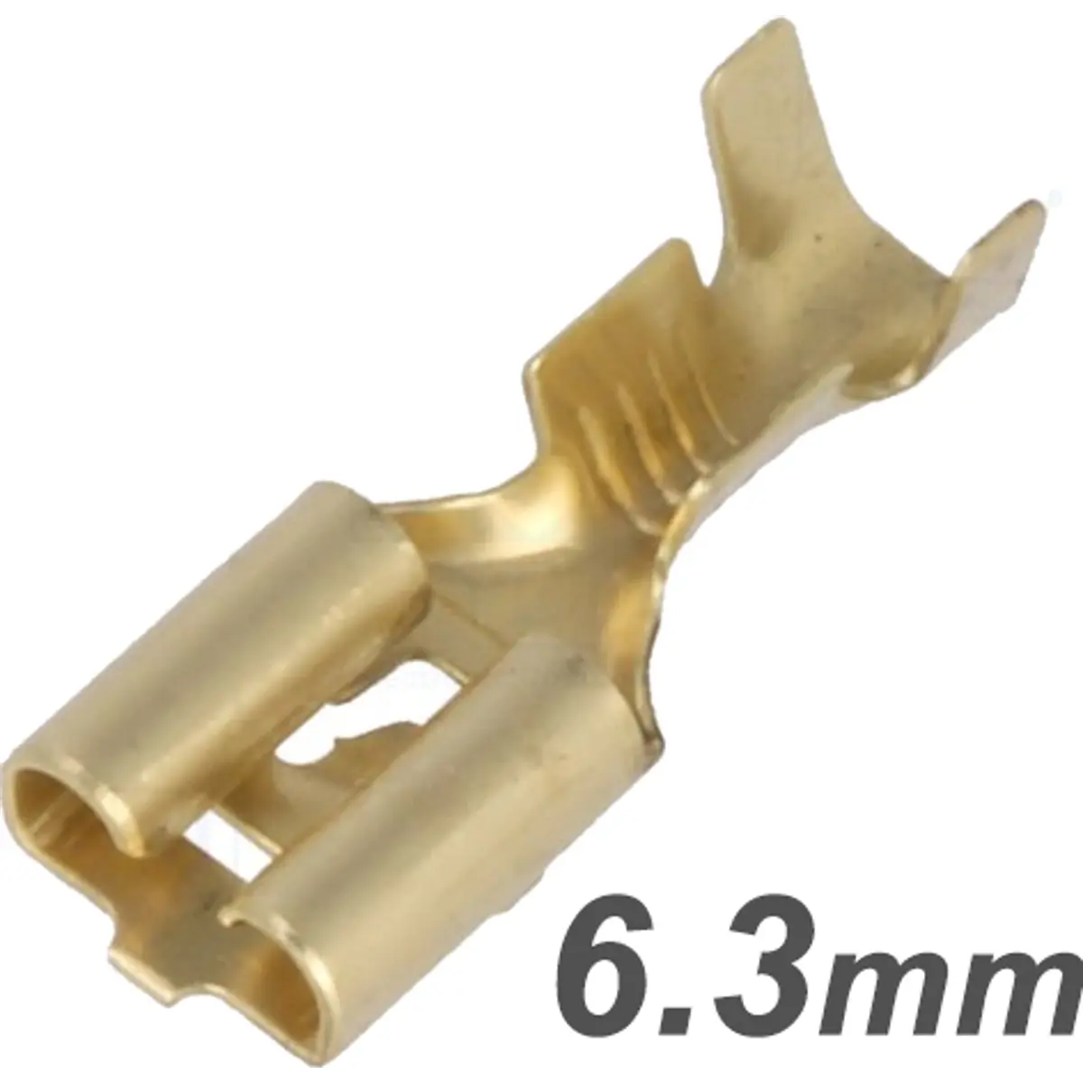 Terminal Faston fêmea com patilha não isolada, para cabos de 1 a 2,5 mm², com largura de 6,3 mm, fabricado em latão. Montagem eléctrica: crimpagem e montagem mecânica com cabo. Conector de perfil plano sem cobertura de contacto, adequado a ligações rápidas, seguras e fáceis de substituir em cablagens de baixa tensão. Ideal para aplicações industriais e de automação que exijam fiabilidade e simplicidade.
