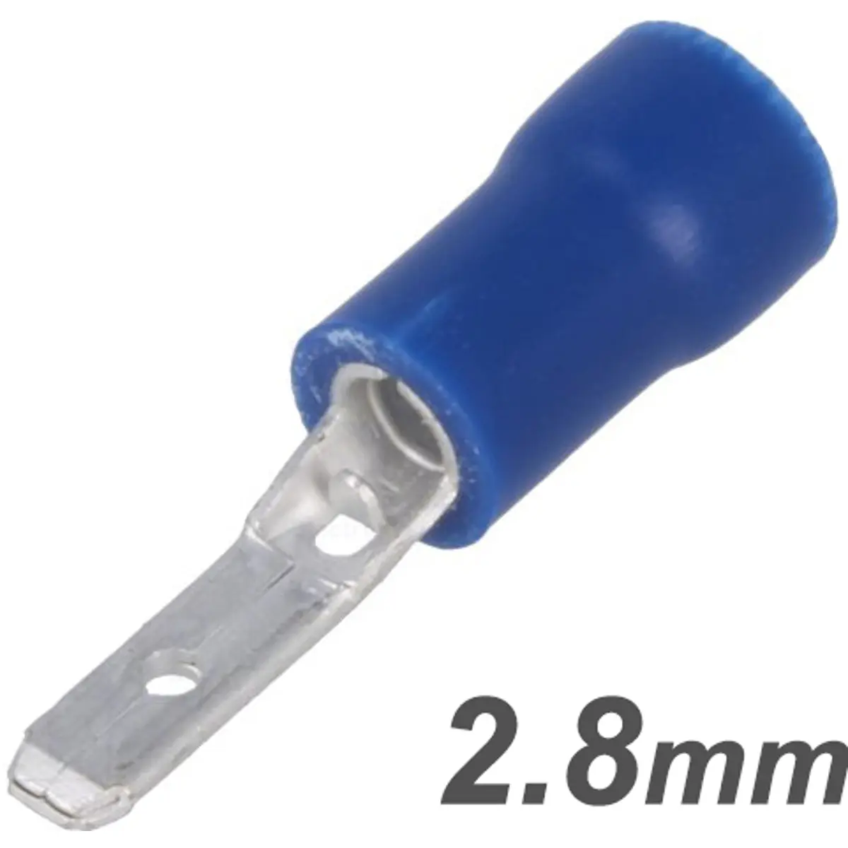 Conector plano, terminal faston macho isolado azul, com ponta isolada e largura de 2,8 mm, destinado a condutores de 1,5 a 2,5 mm². Ideal para montagem mecânica com cabo e montagem eléctrica, proporcionando ligações seguras entre cabos de pequena a média secção. Adequado para uso em painéis e equipamentos, mantendo isolamento elétrico estável e fiável.