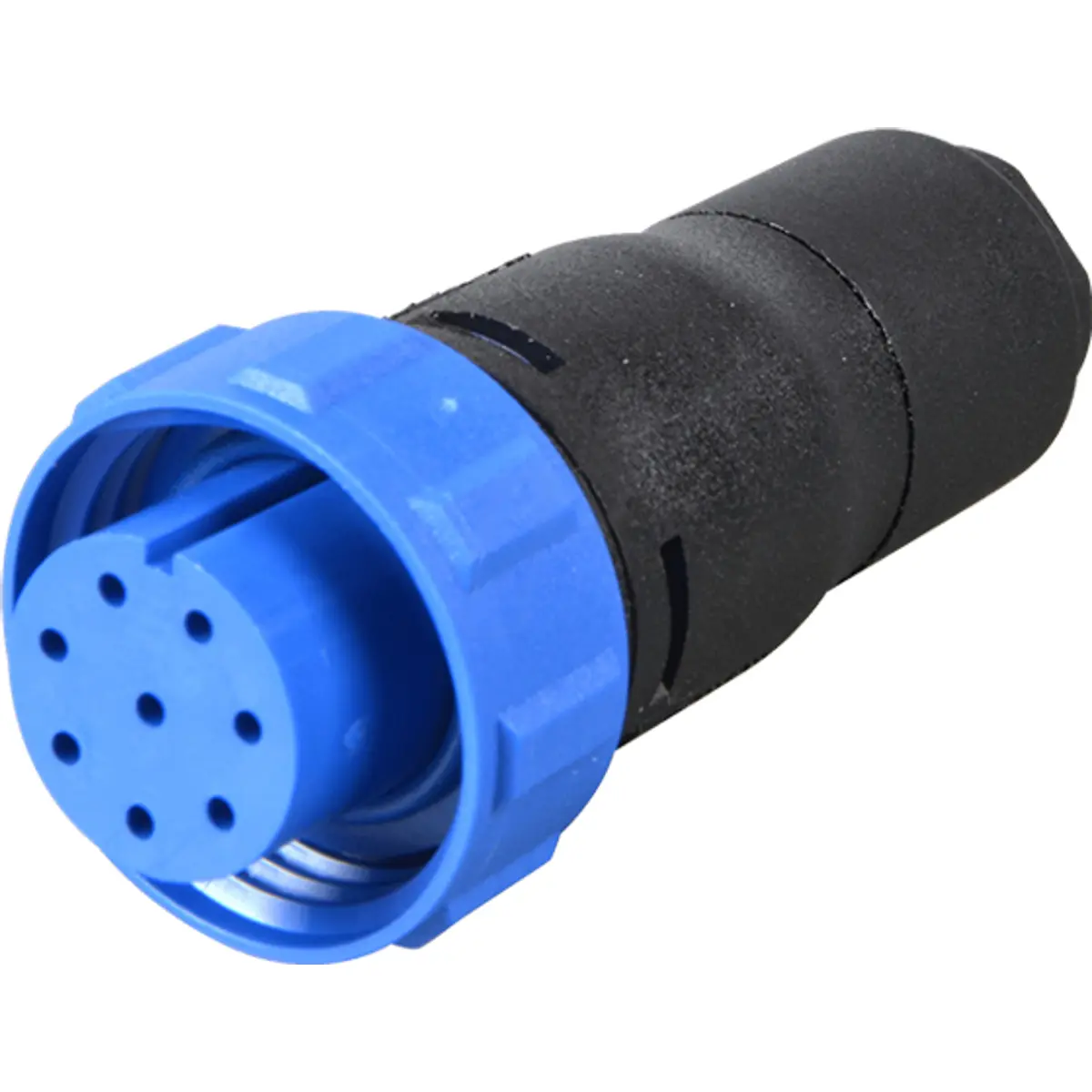 Ficha circular fêmea de 8 pinos para montagem em cabo, com proteção IP68 e material de poliamida. Adequada para temperaturas de funcionamento entre -40..80°C, suporta cabos com diâmetro externo de 6..6.5mm. Dimensões Ø19.1x46mm. Tensão nominal 125V.