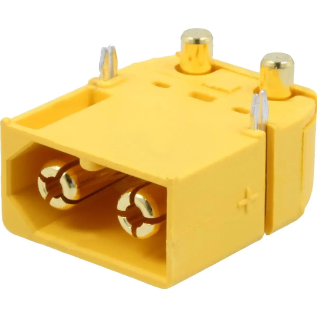 Conector XT60 macho de alimentação DC para PCB, com 2 pinos e orientação angular de 90°, montado via THT. Corrente nominal 30A e tensão até 500V. Contacto em latão com gold flash; carcaça em poliamida amarela. Resistente a temperaturas entre -20 a 120°C e classificado UL94V-0, oferecendo durabilidade mecânica de 1000 ciclos. Adequado para ligações seguras de alimentação DC em PCB e dispositivos que exigem robustez.