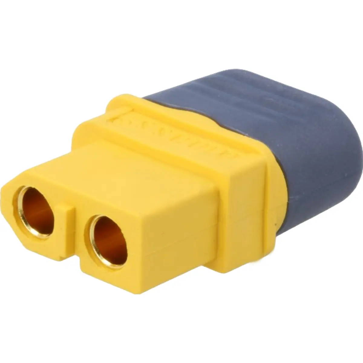 Conector XT60 fêmea de 2 pinos para soldar com proteção de cabo, da série XT60. Montagem mecânica com cabo e montagem elétrica por solda; tipo de alimentação DC, cor amarela. Tensão nominal 500V e corrente nominal 30A, contactos em latão com acabamento gold flash. Corpo em poliamida, classe de inflamabilidade UL94V-0, durabilidade mecânica de 1000 ciclos. Adequado para cabos 12AWG e orientação simples, ideal para ligações DC seguras entre componentes.