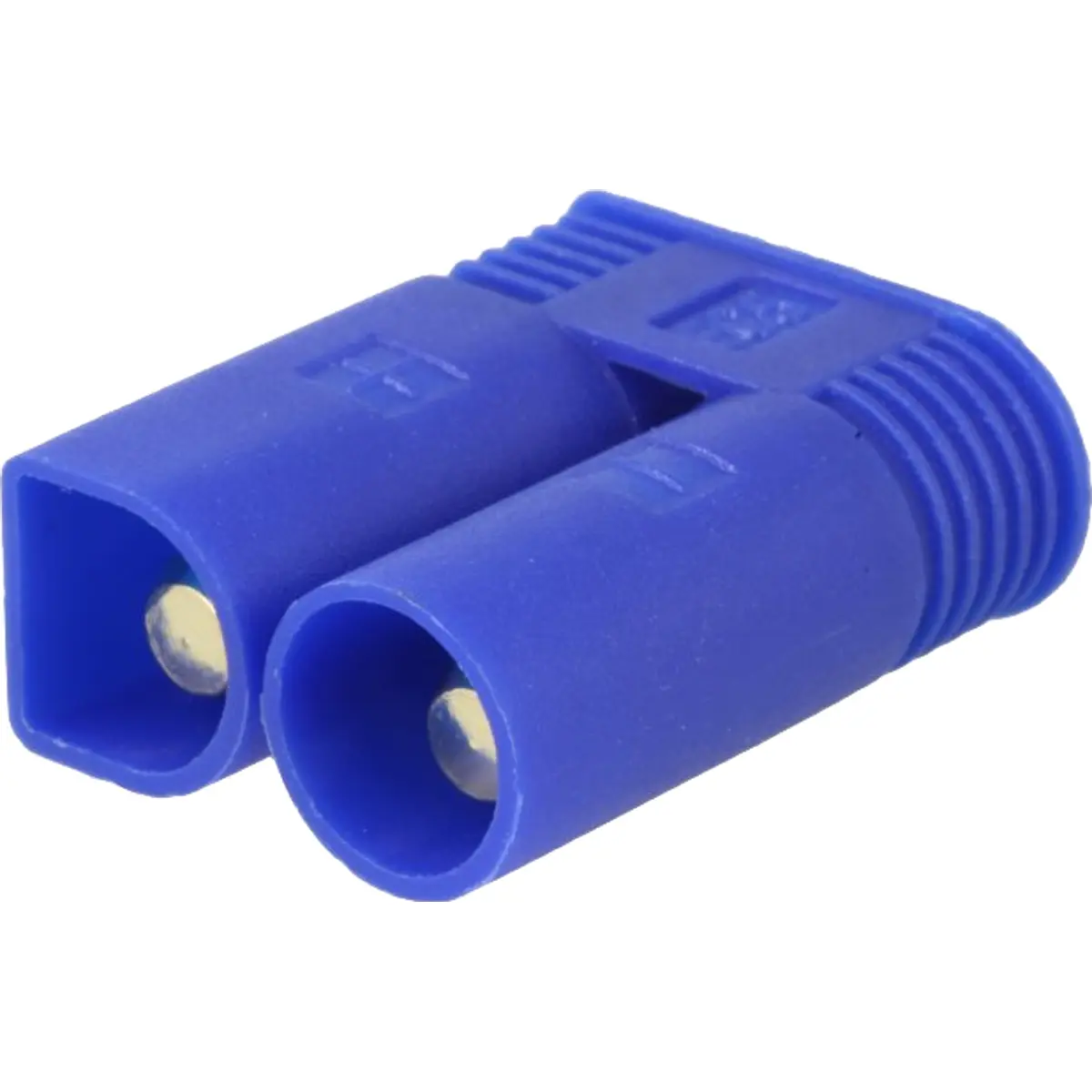 Conector ficha macho EC5 de alimentação DC com 2 pinos, montagem por solda e cabo 10AWG. Construção em poliamida azul, contactos em latão com revestimento gold flash. Tensão nominal de 500V e corrente nominal de 40A, compatível com temperatura de trabalho entre -20°C e 120°C. Classe de inflamabilidade UL94V-0 e durabilidade de até 1000 ciclos. Ideal para ligações seguras e fiáveis em sistemas DC.