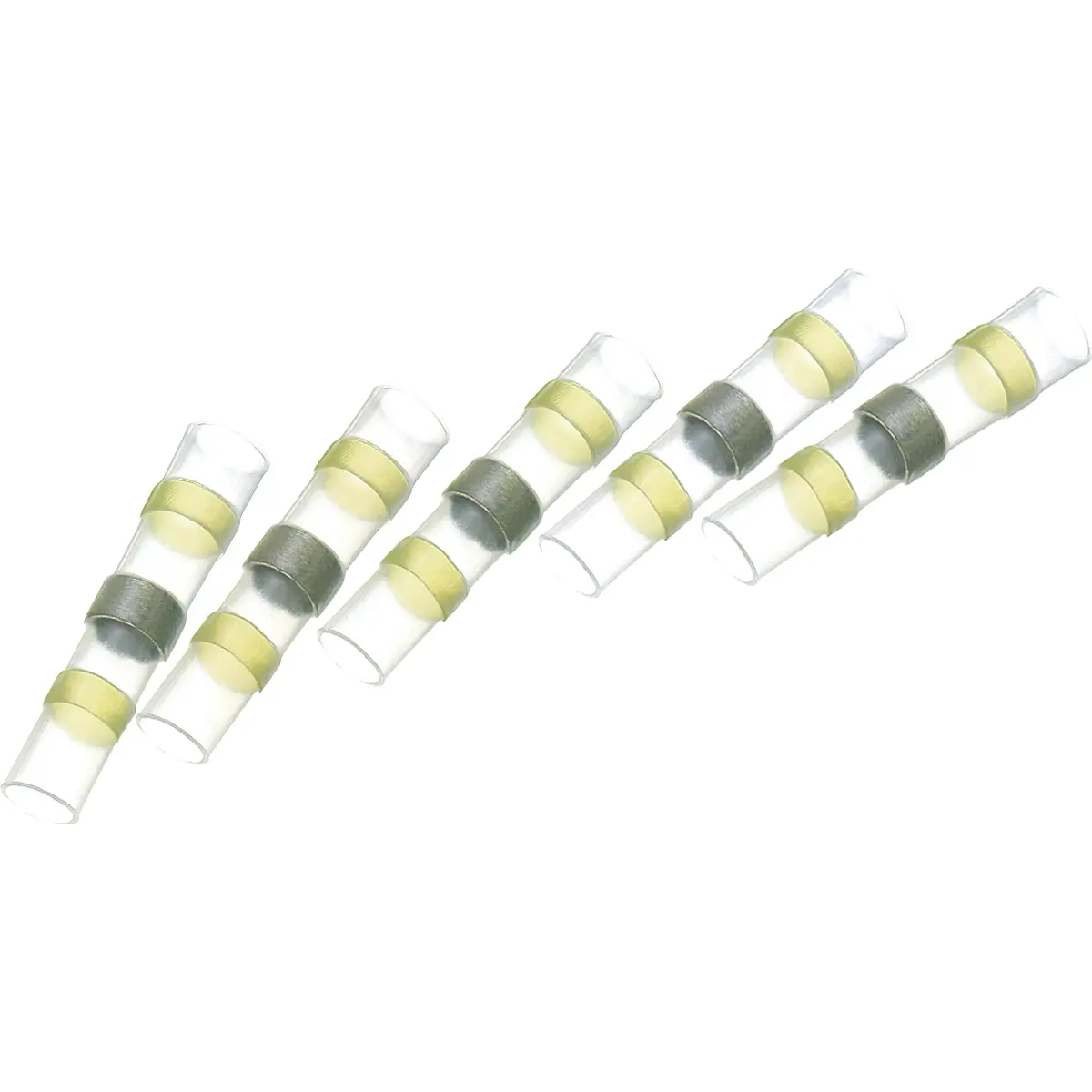 Conjunto de ligadores isolados de auto soldadura térmica para cabos de 4-6 mm², com manga térmica retrátil que se contrai ao calor. O anel de estanho de baixa temperatura derrete e solda permanentemente as duas pontas, garantindo uma união elétrica segura. Possui anéis adesivos retráteis junto às extremidades para impedir a entrada de humidade, protegendo a ligação. Proporciona montagem simples, resistência e estanqueidade adequadas para aplicações elétricas internas ou externas, conforme o ambiente.
