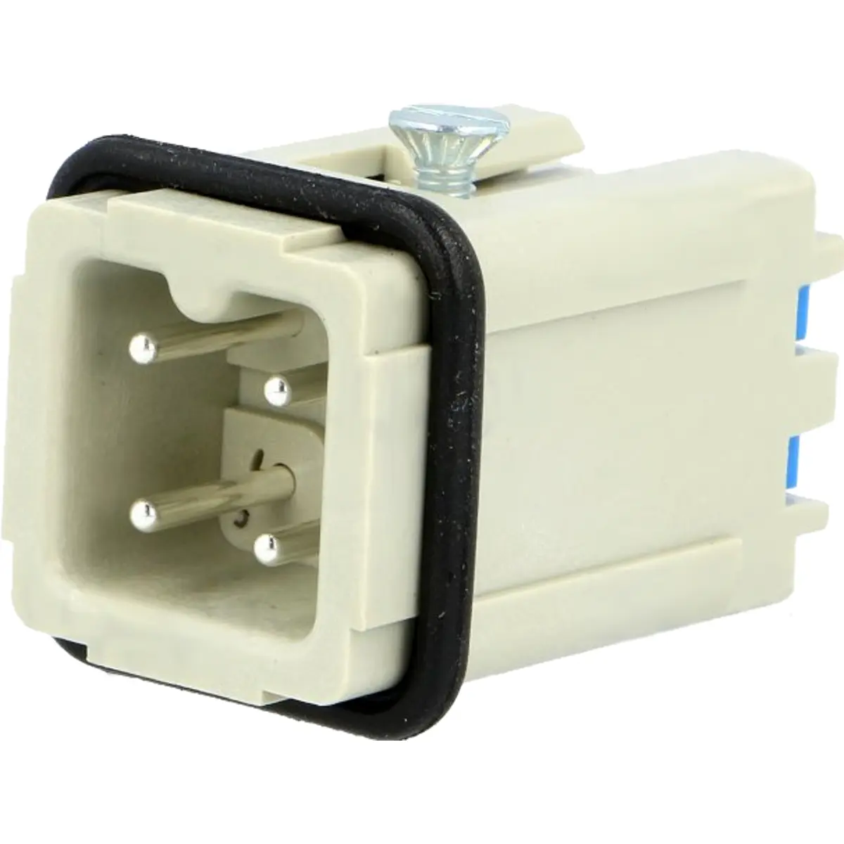 Conector HDC com insert macho, composto por um inserto QuickLock de 4 pinos capaz de suportar 10A e 600V. Afixação do inserto é de 21x21mm, com montagem eléctrica por aperto de trinco QuickLock. Compatível com cabos de 0,5 a 2,5 mm2, com classe de inflamabilidade UL94V-0. Durabilidade mecânica de 500 ciclos, esquema 3+PE para proteção da junta. Ideal para ligações seguras em sistemas industriais que exigem fiabilidade e montagem rápida.