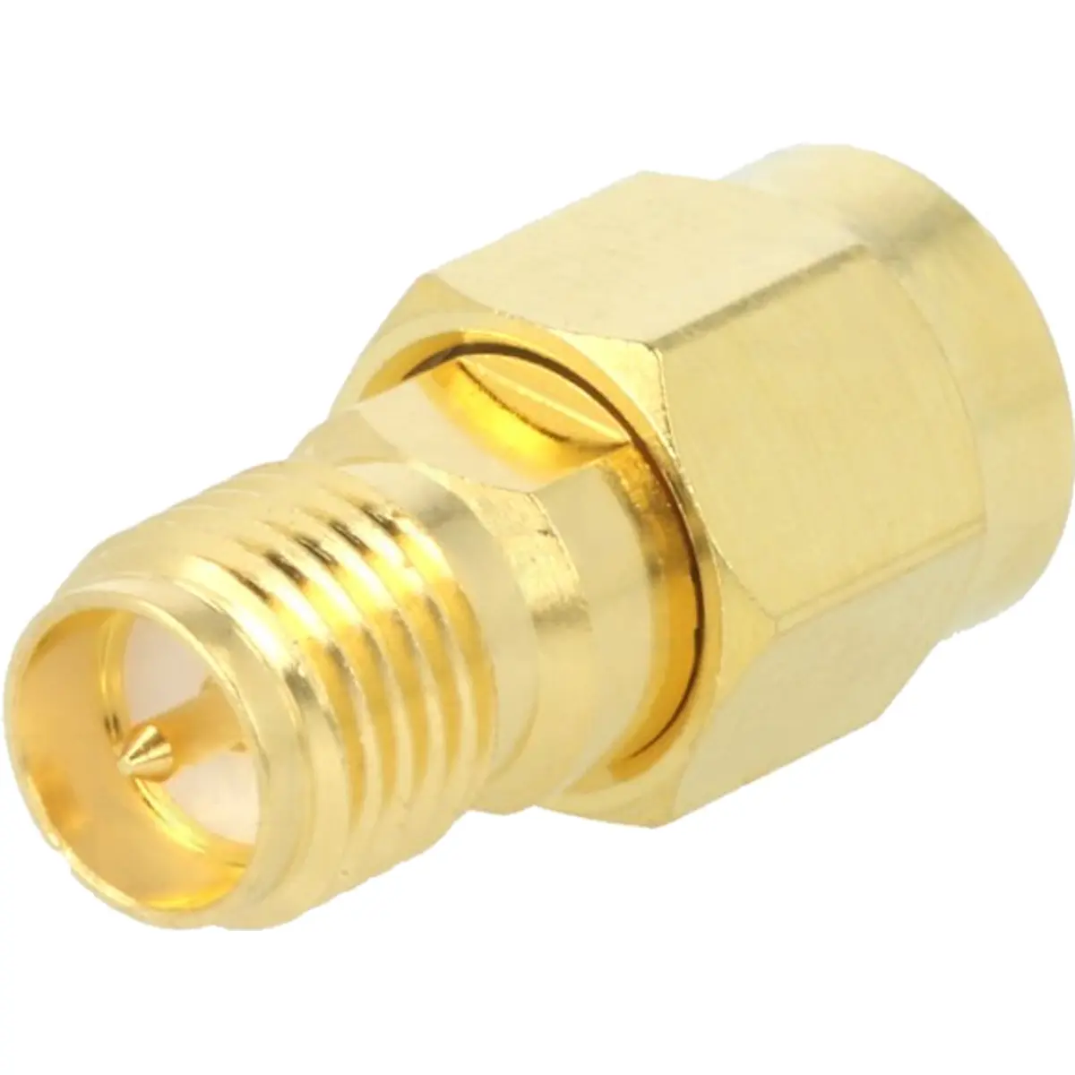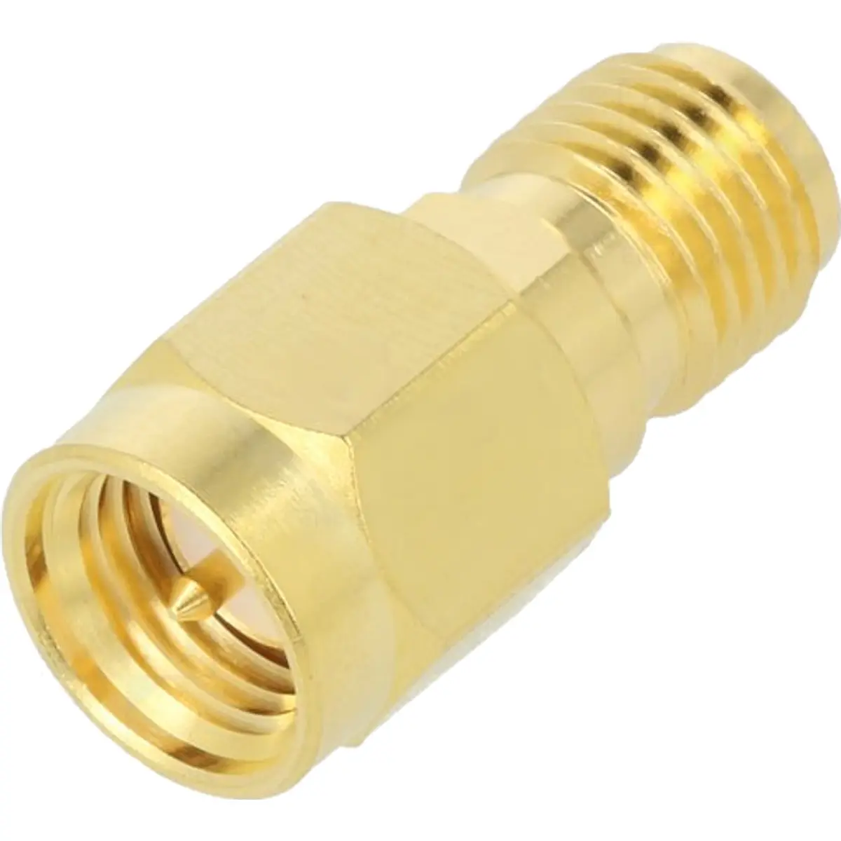 Adaptador RF RP-SMA fêmea para SMA macho, concebido para ligações de rádiofrequência. Apresenta impedância de 50Ω, isolador de teflon, contactos banhados a ouro e frequência máxima de 18GHz. Ideal para interligar componentes RF em testes e sistemas de comunicação, assegurando boa qualidade de sinal e compatibilidade entre conectores RP-SMA e SMA sem introdução de características não descritas no texto.