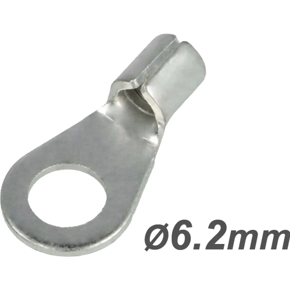O terminal de olhal não isolado é uma ligação elétrica destinada a condutores de 4 a 6 mm². Apresenta furo para parafuso M6 e contacto em cobre, com diâmetro interno de 6,2 mm e capacidade para fios de 12 AWG a 10 AWG. Ideal para ligações seguras em painéis elétricos e equipamentos, oferecendo boa condutividade e montagem simples.
