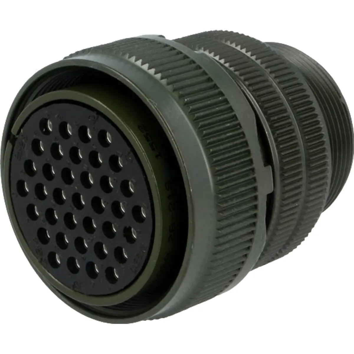 Ficha circular fêmea com 37 contactos para montagem por solda em cabos. Rosca interna com junta roscada para bloqueio, contatos banhados a prata e corpo em alumínio esverdeado. Compatível com MIL-C-5015, configuração de pinos 28-21 e orientação em linha reta. Tensão nominal 500V AC e 700V DC, tamanho 28, adequado para aplicações industriais de elevada fiabilidade.