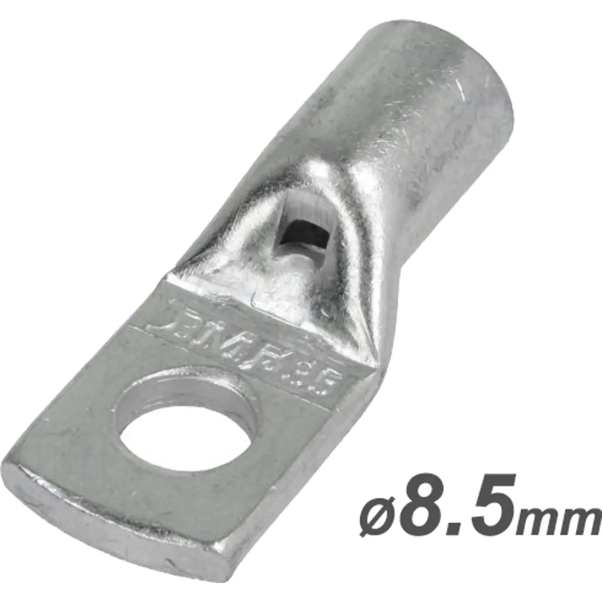 Terminal de olhal não isolado com furo para parafuso M8, destinado a montagem elétrica frisada e montagem mecânica para cabo. Fabricado em cobre com chapeamento estanhado, oferece diâmetro interno de 8,5 mm e secção de fio de 25 a 35 mm². Ideal para ligações elétricas rápidas e seguras em cablagem, sem isolamento, com montagem simples em cabo.