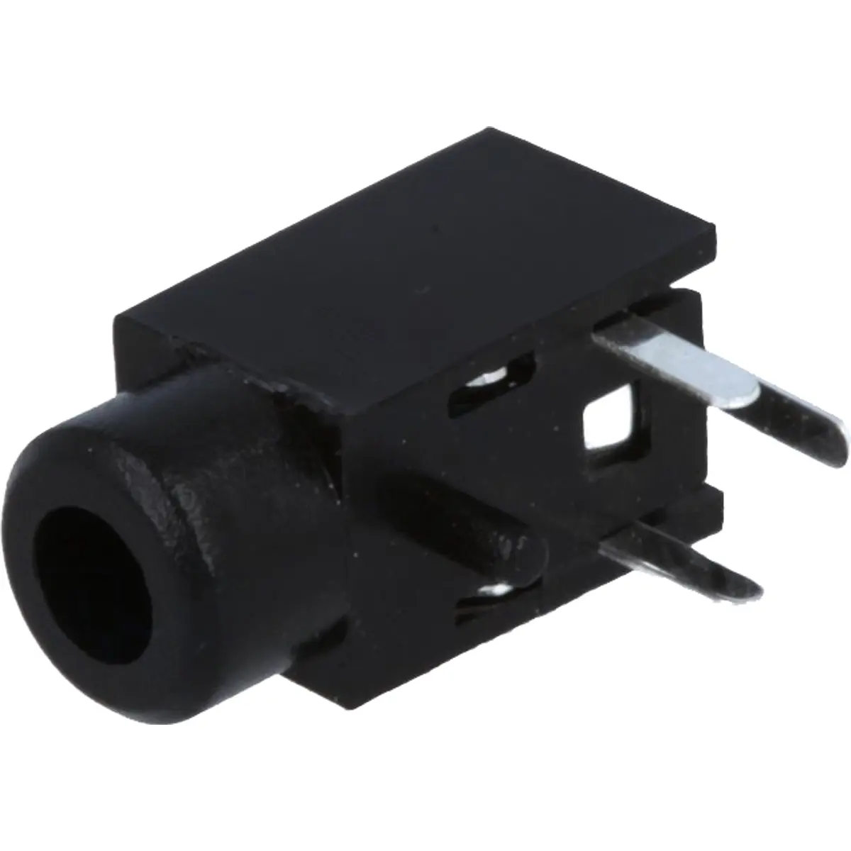Conector jack fêmea de 2,5 mm mono com interruptor on/off orientado a 90°, para montagem em PCB (THT). Ideal para ligações de áudio ou sinais com comutação integrada, oferecendo confiabilidade e facilidade de solda em projetos de eletrónica.