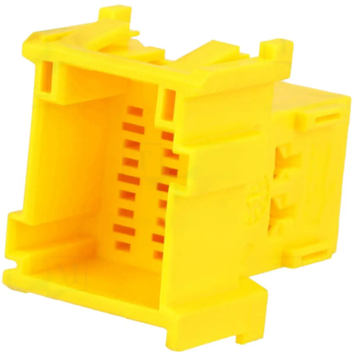 Conector macho MCP de 9 pinos, tipo fio-fio, para montagem mecânica em cabo. Versão amarela com variante sem contactos, adequada para ligações inter-fios em sistemas MCP. Facilita ligações fio-a-fio com encaixe estável, sem contactos incluídos, permitindo preparação ou substituição conforme o circuito. Ideal para montagem em painéis ou cabos, com compatibilidade para módulos MCP e aplicações que exigem uma solução simples, compacta e versátil.