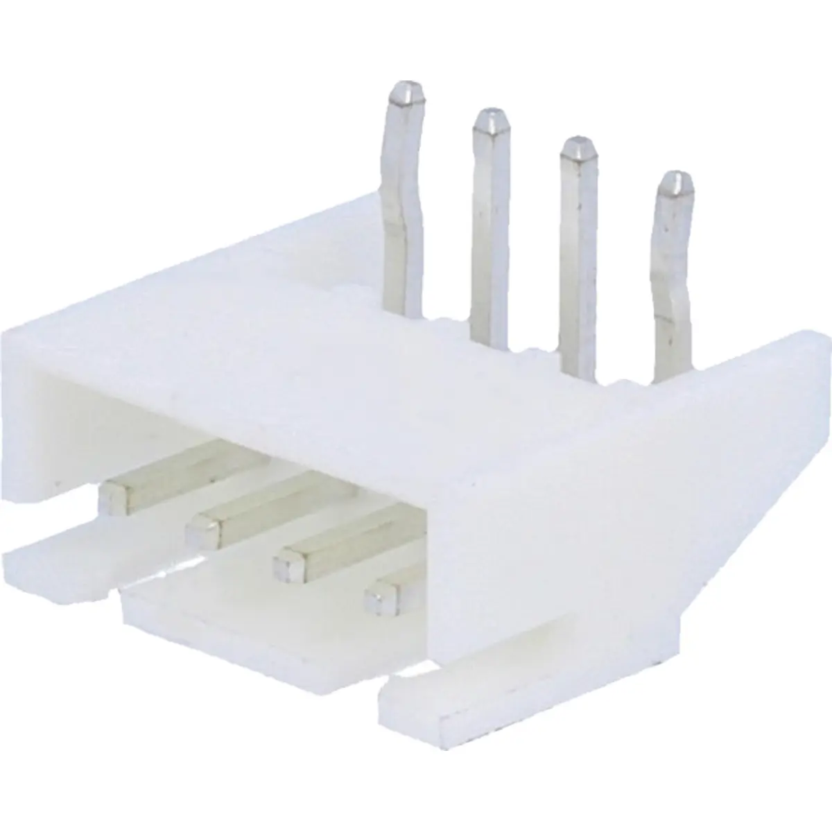 Conector macho de PCB com passo de contatos de 2,5 mm e configuração 1x4. Montagem em THT (through-hole). Tensão nominal de 250 V e corrente máxima de 3 A. O corpo é poliamida com inflamabilidade UL94V-0. Opera entre -25 °C e 85 °C, com orientação de 90°. Ideal para ligações elétricas em montagens de placas, oferecendo fiabilidade, montagem simples e compatibilidade com alimentação e sinal, sem referência a marcas.
