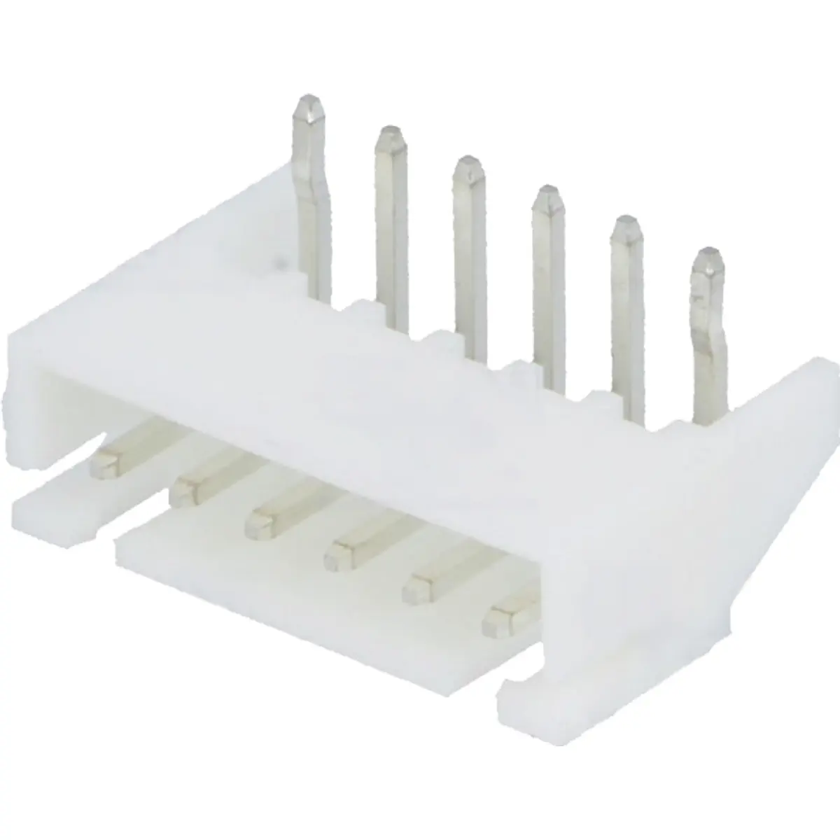 Conector de PCB macho com passo de 2,5 mm e 6 contactos, ângulo de 90°, montagem em THT para ligações em placas. Aceita tensão nominal de 250 V e corrente máx. de 3 A. A resistência de contacto chega a 10 mΩ. O corpo é feito de poliamida e possui inflamabilidade UL94V-0. Opera em faixa de temperatura de -25 °C a 85 °C. Configuração de pinos 1x6.