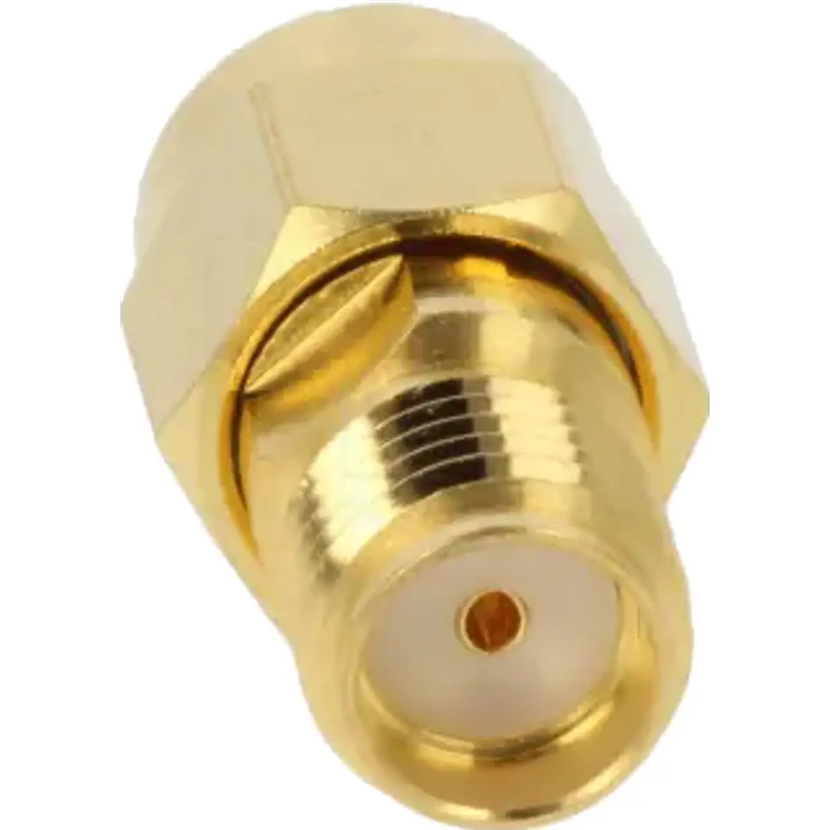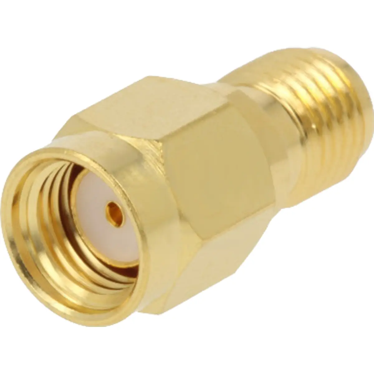 Adaptador RF de 50 ohm, entre RP-SMA macho e SMA fêmea, com dielétrico de teflon, suportando frequências até 18 GHz. Ideal para ligações coaxiais de alto desempenho em sistemas de radiofrequência, testes de bancada e montagem de antenas. Conjunto compacto e com baixa perda de sinal.