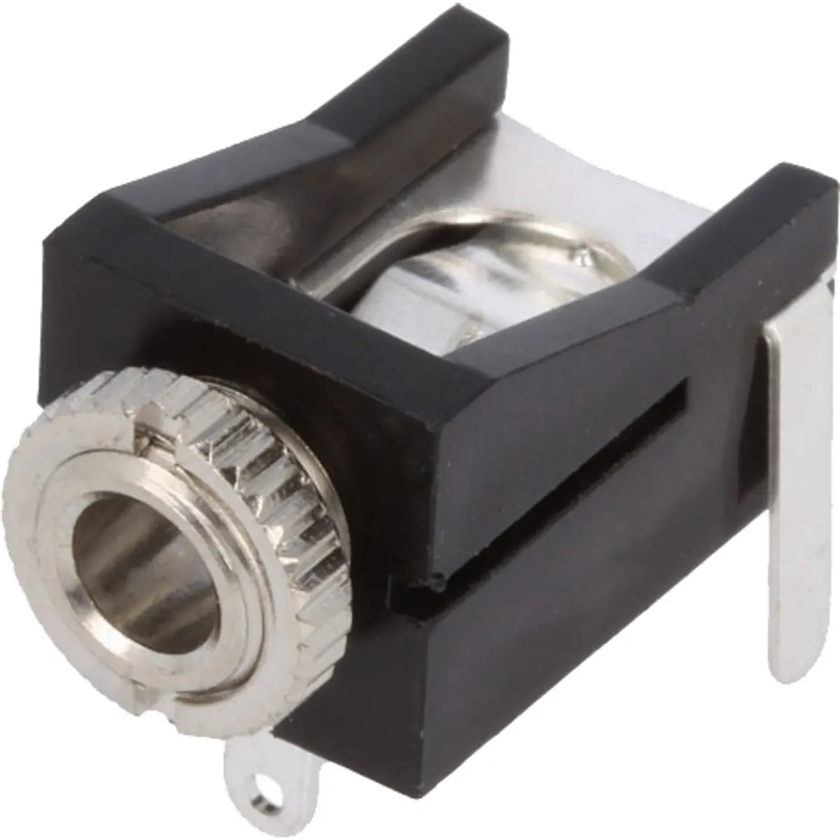 Conector jack de 3,5 mm fêmea para painel com interruptor on/off, variante mono e três terminais. Possibilita montagem mecânica em painel e montagem elétrica THT, adequado para aplicações de áudio e dispositivos que requerem comutação de sinal. Fornece ligação estável, isolamento básico e integração simples de interfaces de áudio com função de comutação.