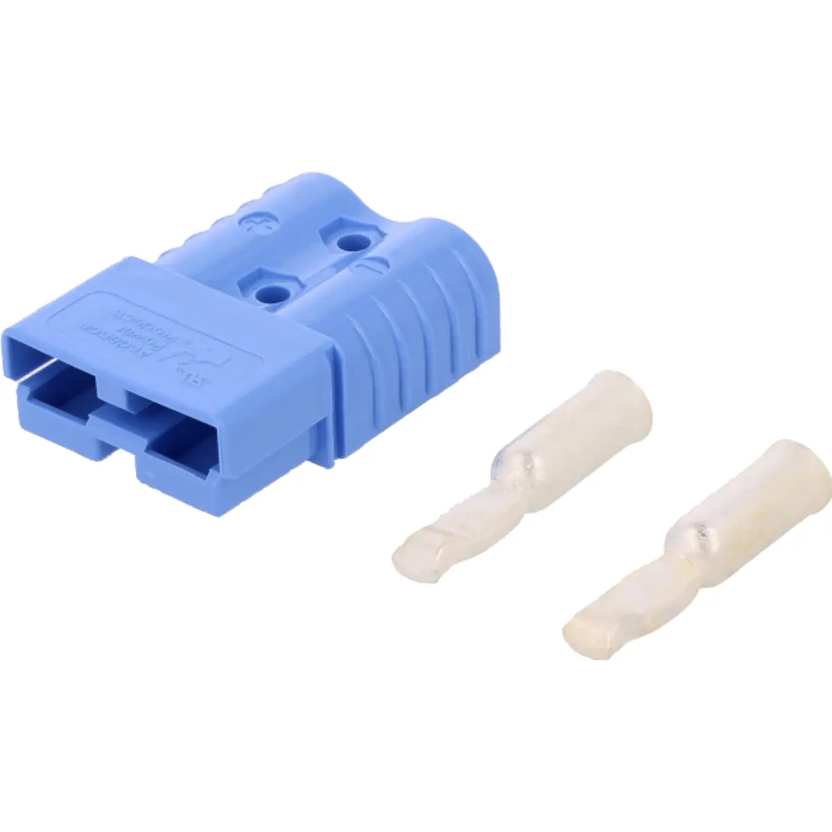 Conector de cablagem do tipo hermafrodita com 2 pinos para montagem mecânica em cabo, corpo em policarbonato azul, contactos em liga de cobre banhados a prata, adequado a tensão nominal de 600V e corrente máxima de 120A. Compatível com fio 6AWG e seção transversal de 13,3 mm², oferecendo fiabilidade e resistência para ligações seguras em painéis e cabos.