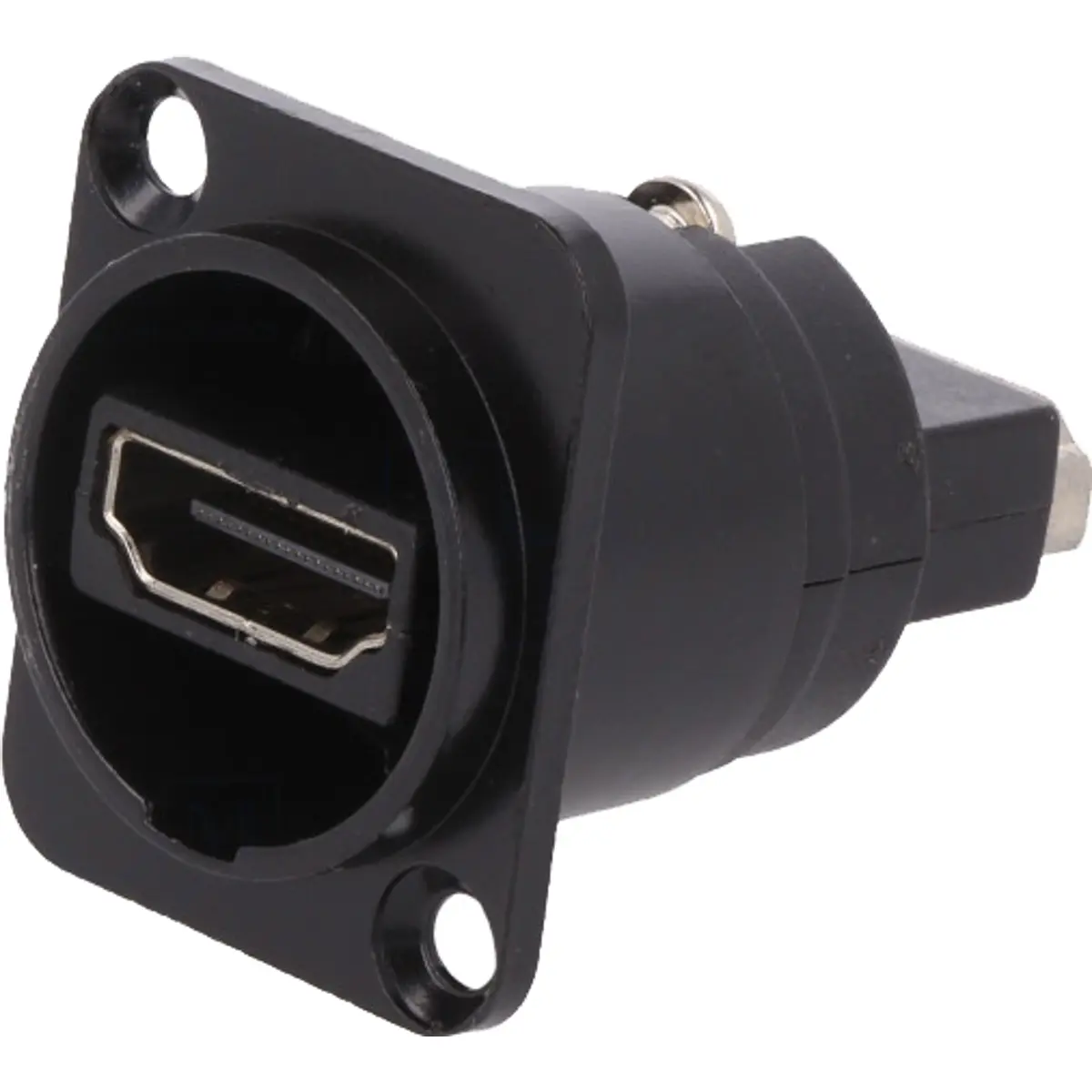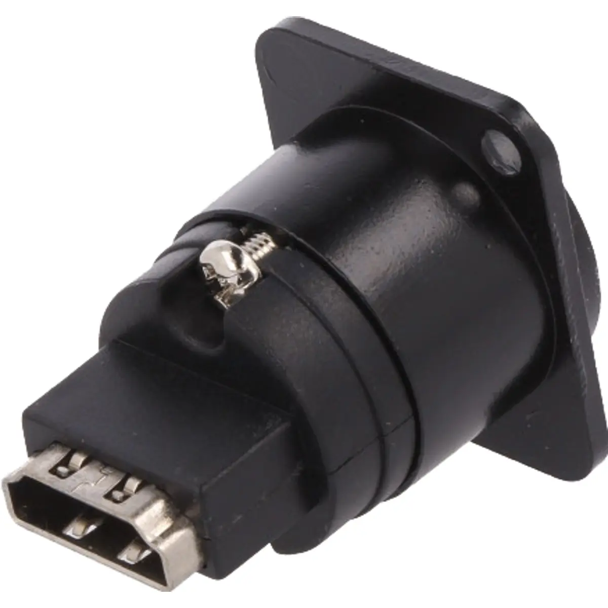 Ficha HDMI para painel com conector blindado, ideal para cabo de extensão. Possui passo de furos de montagem de 19x24mm e montagem mecânica por furo de parafuso escareado com flange de 2 furos para montagem em painel. Corpo em metal preto, resistente e durável. Compatível com aplicações que exigem montagem em superfície, facilitando ligações HDMI seguras e ordenadas em equipamentos de perfil baixo.