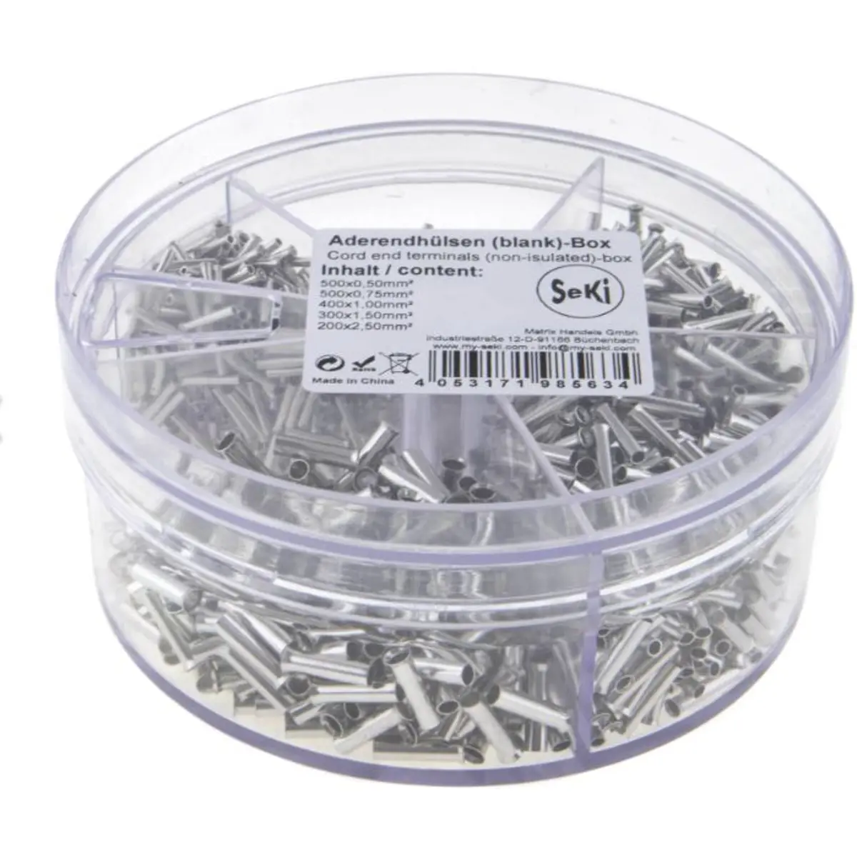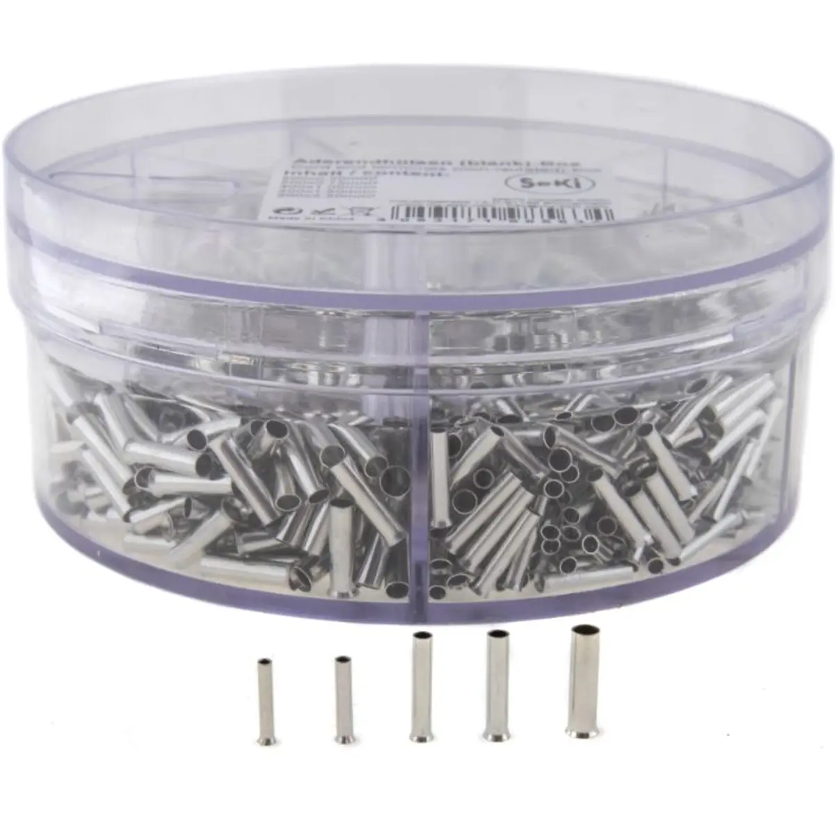 Sortido de 1.900 ponteiras não isoladas distribuídas em cinco tipos, com seção transversal de 0,50mm2, 0,75mm2, 1,00mm2, 1,50mm2 e 2,50mm2. Total de peças: 500x 0,50mm2, 500x 0,75mm2, 400x 1,00mm2, 300x 1,50mm2 e 200x 2,50mm2. Este conjunto facilita a seleção de pontas para várias utilizações em eletricidade e electrónica, mantendo gestão de stock e disponibilidade.