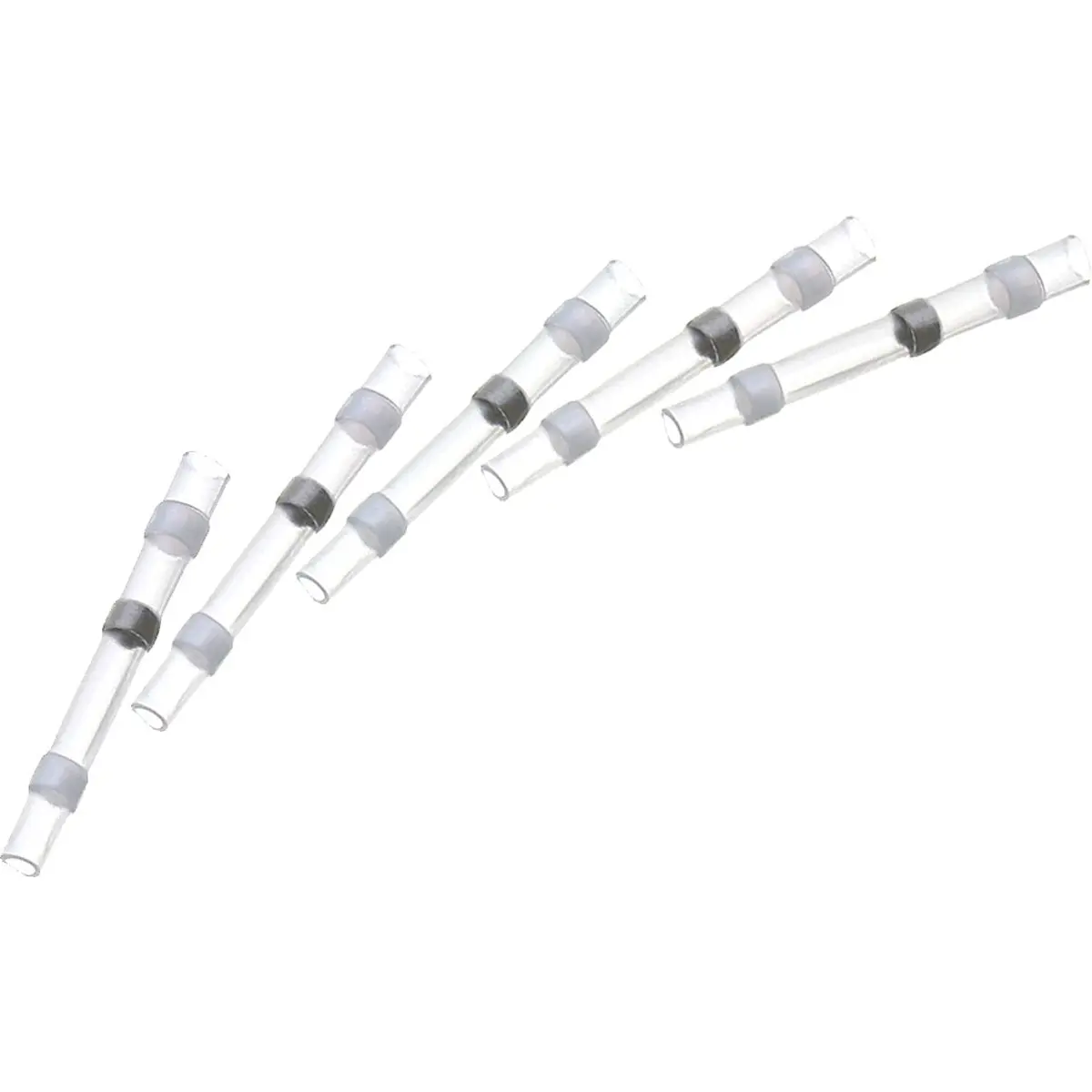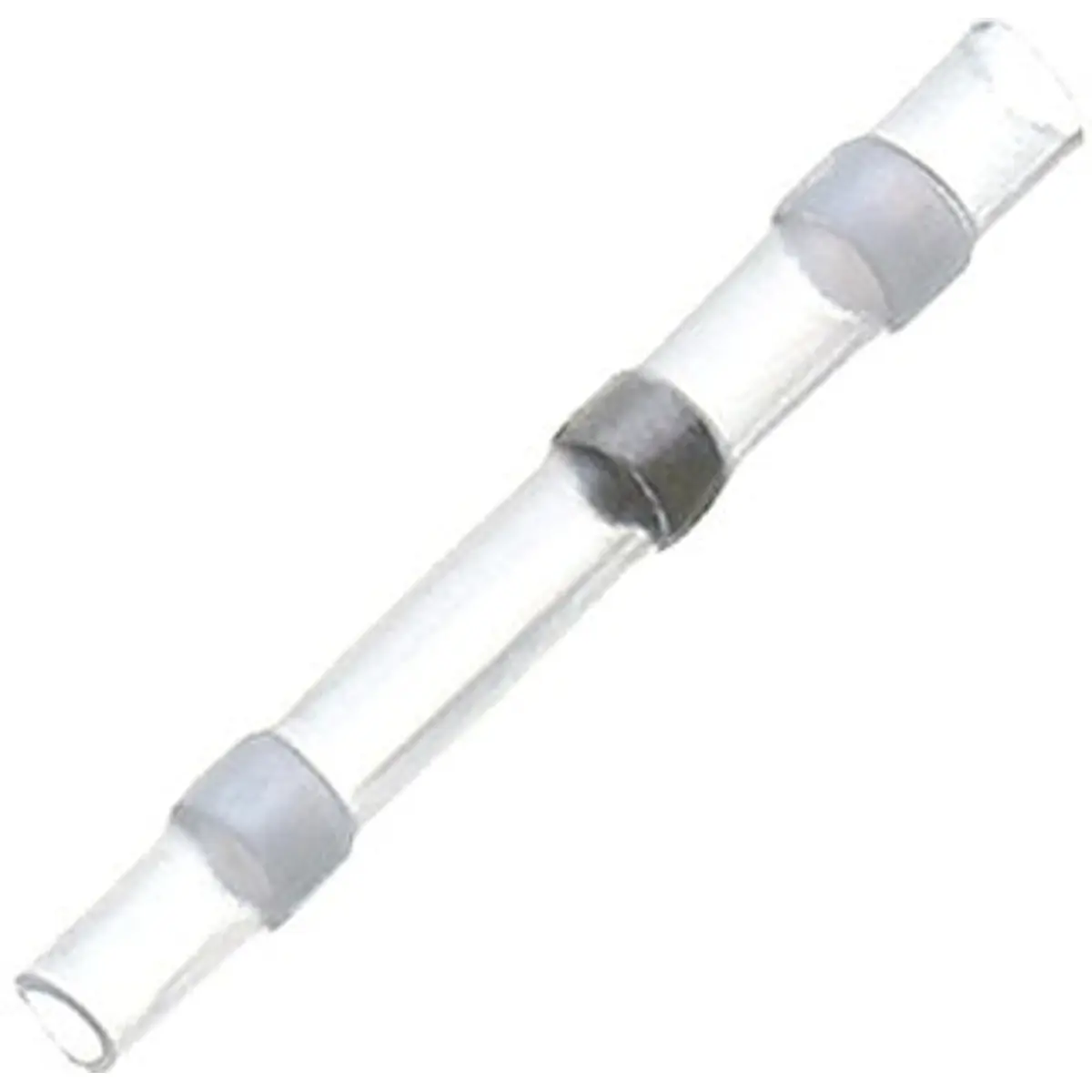 Ligador isolado de auto soldadura térmica estanque para fios 0,2-0,5 mm² (26-24 AWG). Descascar, introduzir as pontas até ao centro e aplicar calor; a manga térmica retrai e o anel de estanho de baixa temperatura derrete, soldando permanentemente as pontas. Existem anéis adesivos retráteis perto das extremidades que impedem a entrada de humidade, proporcionando uma ligação segura e durável, simples de usar em cablagem eléctrica.